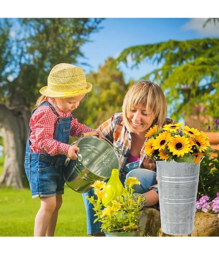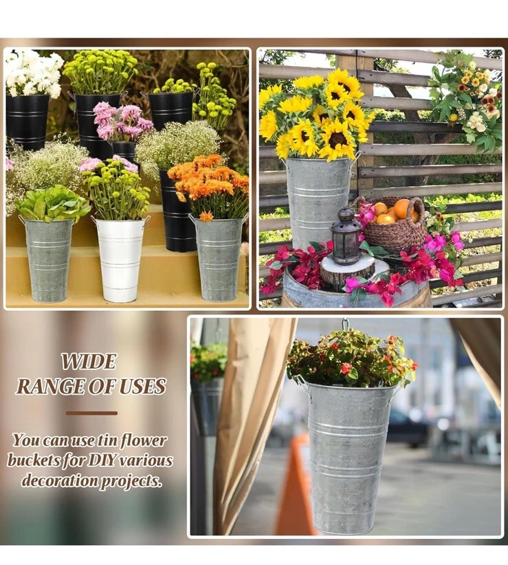 Top highlights Material Metal Color Large silver Set of 4 Special Feature Rust prevention, waterproof Style French Country Planter Form Plant Pot Shape Cylindrical ✿✿PREMIUM METAL MATERIAL - The galvanized vase is made of thickened and high-quality metal with a galvanized coating on the surface to prevent rusting,It has a waterproof coating inside, which is strong, durable and not easily deformed, and can provide excellent durability and long service life. ✿✿DIMENSIONS - Set of 8 premium quality metal buckets. Each vase is 7.48 x 7.48 x 12.08 inches tall with a bottom diameter of 5.13 inches.. The durable 4-point connected handles on the metal vases make them as functional as they are elegant. ✿✿GALVANIZED FLOWER VASES - Bring a charming rustic flair to your home decor with these decorative metal flower vases. Pair them with real, artificial flowers or plants to complete the vintage french country look.These table vases are ideal for flower arrangements, dried flowers or plants. Perfect as decor for restaurants, you can use the rustic vases on their own to elevate the look of any space. ✿✿ELEGANT DECORATION - The classic retro appearance of the galvanized flower vase can perfectly match any home decoration, adding an elegant and rustic atmosphere to your house. The galvanized finish has a well-designed pattern texture,These farmhouse vases for flowers will add a touch of rustic decor to your home or kitchen, you will love this vintage vase.