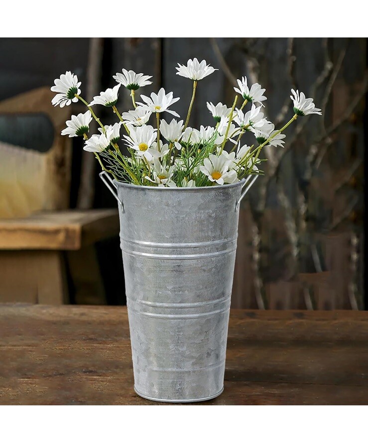 Top highlights Material Metal Color Large silver Set of 4 Special Feature Rust prevention, waterproof Style French Country Planter Form Plant Pot Shape Cylindrical ✿✿PREMIUM METAL MATERIAL - The galvanized vase is made of thickened and high-quality metal with a galvanized coating on the surface to prevent rusting,It has a waterproof coating inside, which is strong, durable and not easily deformed, and can provide excellent durability and long service life. ✿✿DIMENSIONS - Set of 8 premium quality metal buckets. Each vase is 7.48 x 7.48 x 12.08 inches tall with a bottom diameter of 5.13 inches.. The durable 4-point connected handles on the metal vases make them as functional as they are elegant. ✿✿GALVANIZED FLOWER VASES - Bring a charming rustic flair to your home decor with these decorative metal flower vases. Pair them with real, artificial flowers or plants to complete the vintage french country look.These table vases are ideal for flower arrangements, dried flowers or plants. Perfect as decor for restaurants, you can use the rustic vases on their own to elevate the look of any space. ✿✿ELEGANT DECORATION - The classic retro appearance of the galvanized flower vase can perfectly match any home decoration, adding an elegant and rustic atmosphere to your house. The galvanized finish has a well-designed pattern texture,These farmhouse vases for flowers will add a touch of rustic decor to your home or kitchen, you will love this vintage vase.
