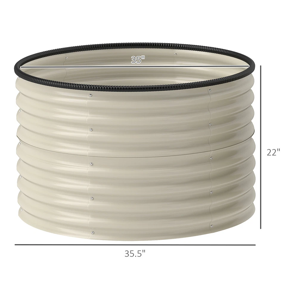 Features: - Set of two raised garden beds - Open bottoms allow drainage while accommodating roots - Made of thick galvanized steel to outlast outdoor conditions without issue - The improved rubber-sealed tops make them safe to all around - An easy-to-assemble design gets your garden up and going fast Specification: - Color: Cream White - Material: Galvanized Steel - Overall Dimensions: 35.4" Dia. x 22" H - Interior Dimensions: 35" Dia. x 22" H - Single Curved Panels: 20.5" W x 11.75" H Package Includes: - 2 x Galvanized Planter - 16 x Screw - 1 x Manual