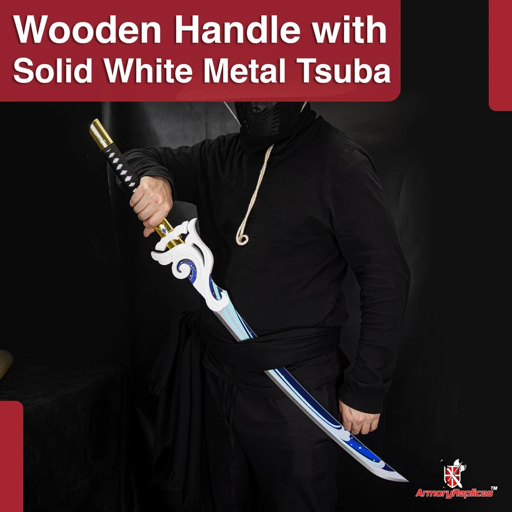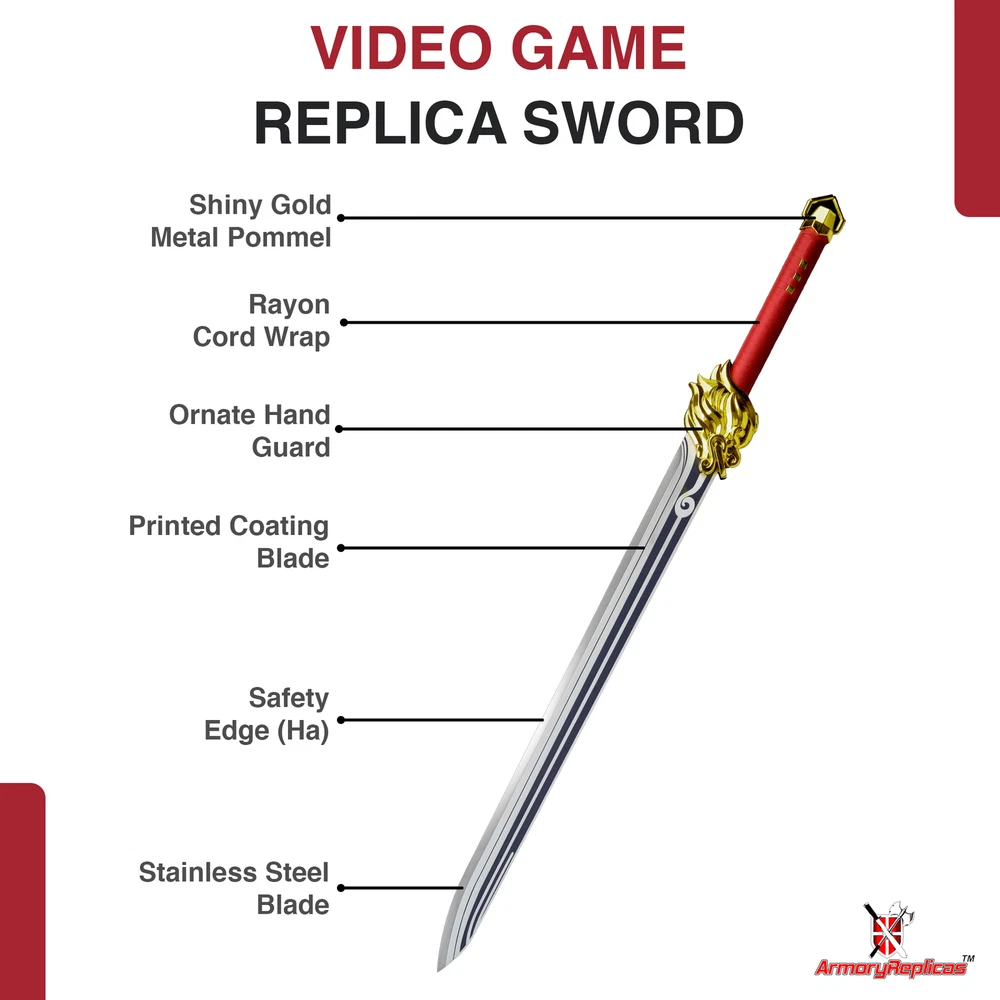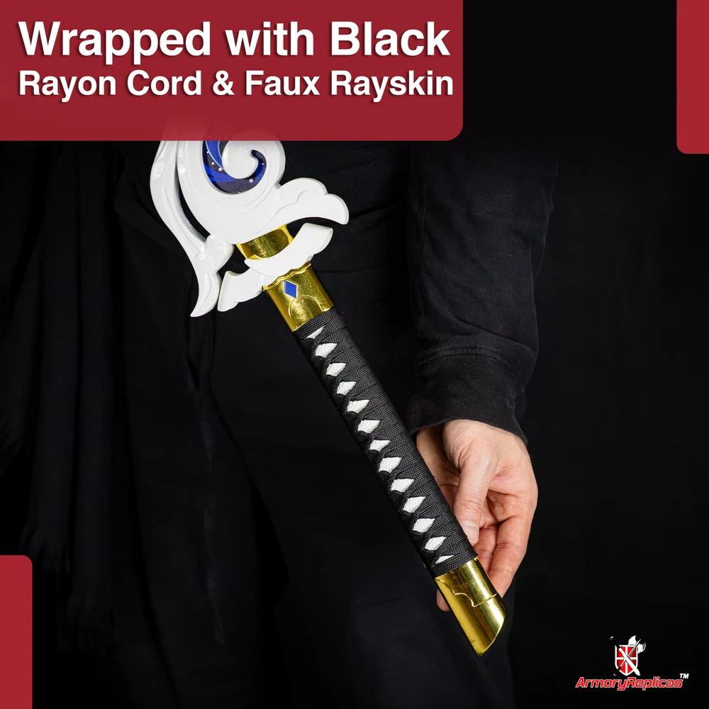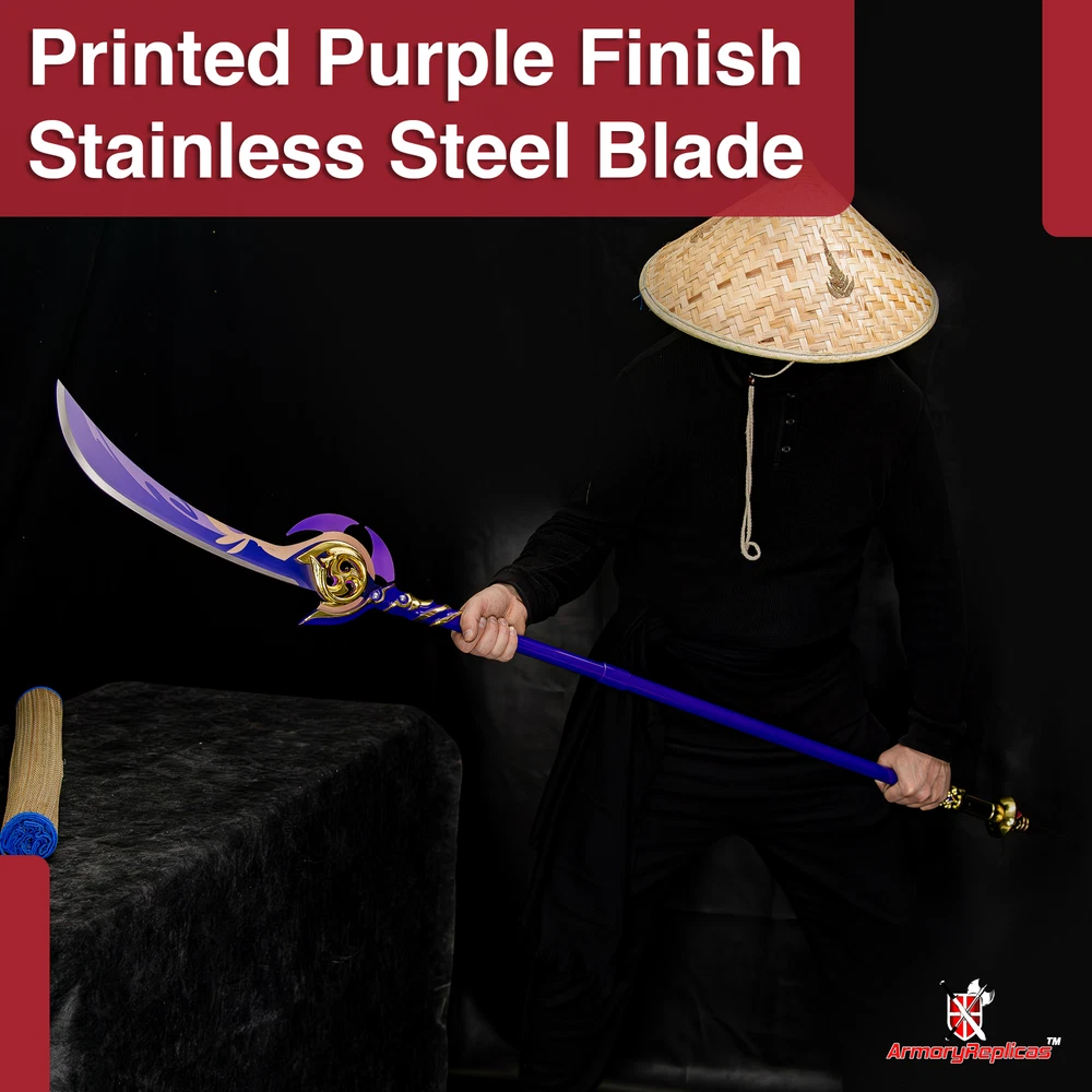 Freedom-Sworn Sword Overall Length: 45.25 inches, Blade Length: 27 inches, Handle Length: 12 inches, Video Game Replica Sword, Stainless Steel Blade, Printed Blue Finish, Wooden Handle, Gold Zinc Alloy Finish, Faux Jewel Accents. Lion's Roar Sword Overall Length: 37.25 inches, Blade Length: 24.5 inches, Handle Length: 9.75 inches, Video Game Replica Sword, Stainless Steel Blade, Printed Finish, Wooden Handle, Red Rayon Wrapping, Gold Zinc Alloy Fittings Akuoumaru Sword Overall Length: 43 inches, Blade Length: 23.5 inches, Handle Length: 12 inches, Video Game Replica Sword, Stainless Steel Blade, Printed Finish, Wooden Handle, Faux Rayskin Cover, Black Rayon Wrapping, Gold/White Zinc Alloy Fittings Engulfing Lightning Sword Overall Length: 69 inches, Blade Length: 16 inches, Handle Length: 49 inches, Video Game Replica Naginata, Stainless Steel Blade, Printed Purple Finish, Factory Edge, Aluminum Handle, Gold Zinc Alloy Fittings, Faux Pearl Accents Replicated from the 5-star polearm obtained through weapon event wishes, this naginata is made to look as though it came straight from the popular action roleplay video game Genshin Impact. The blade is constructed of stainless steel with a factory edge and has a printed coating to perfectly duplicate the beautiful purple blade in the game. The handle is made from aluminum with a vibrant purple finish and gold zinc alloy fittings. The handle comes in two pieces which easily screw together to create this near 70-inch weapon. The ornate guard is also made from zinc alloy in a pinwheel design with a gorgeous golden sheen. Light pearls are inlayed in the guard for even more elaborate detail. Now you can bring home this legendary piece for your collectio