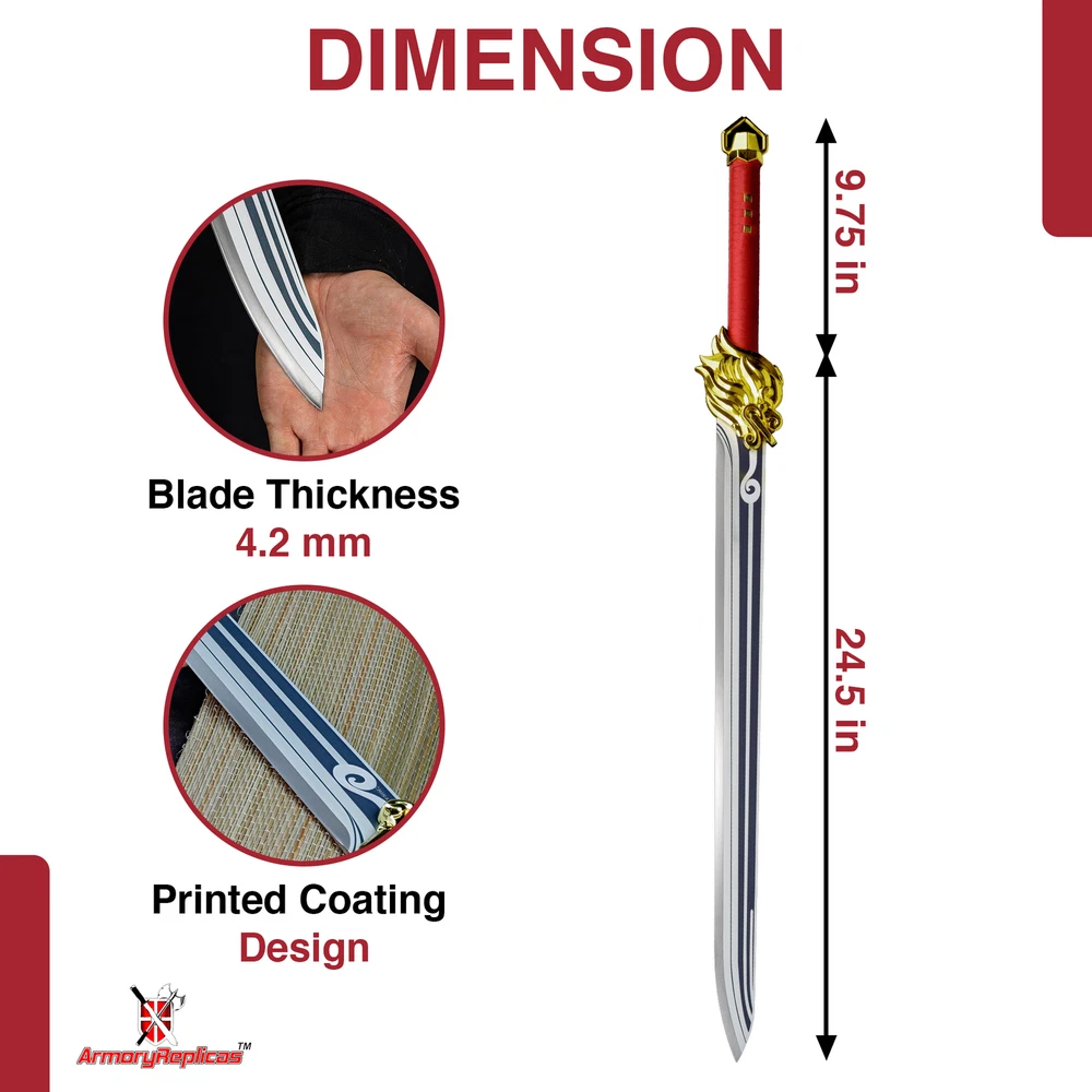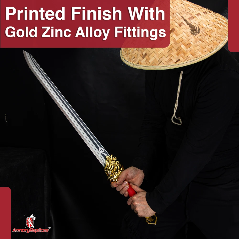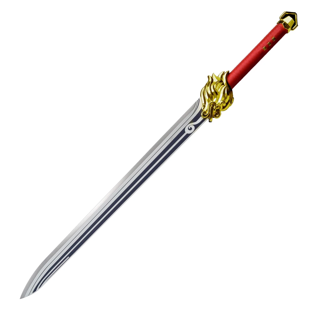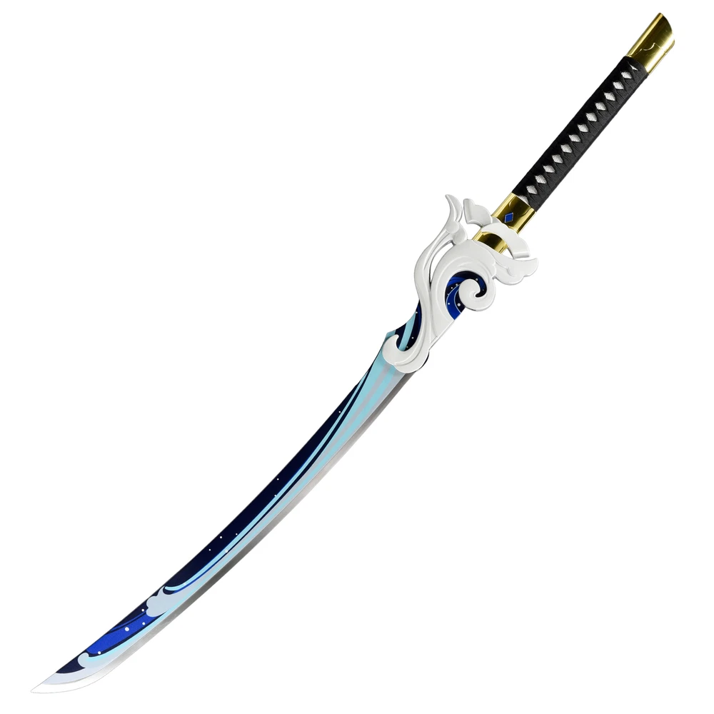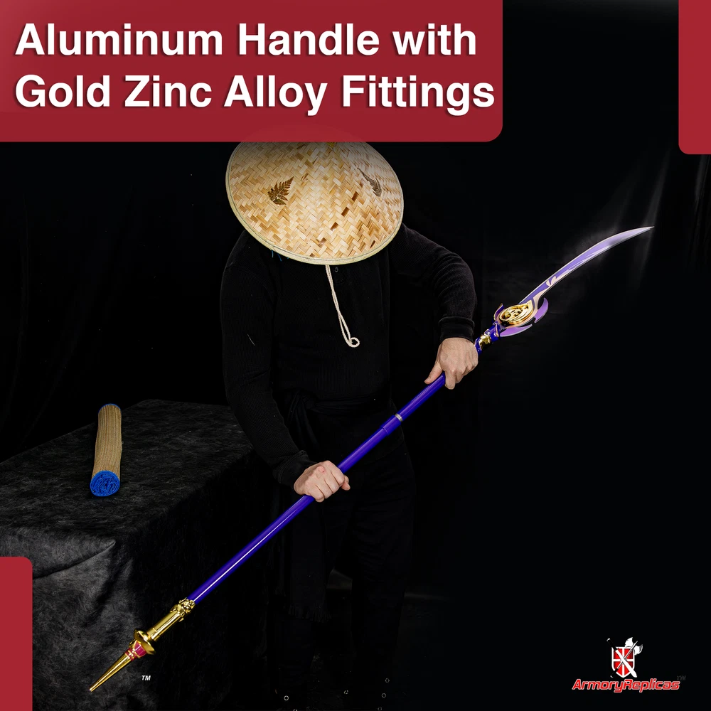 Freedom-Sworn Sword Overall Length: 45.25 inches, Blade Length: 27 inches, Handle Length: 12 inches, Video Game Replica Sword, Stainless Steel Blade, Printed Blue Finish, Wooden Handle, Gold Zinc Alloy Finish, Faux Jewel Accents. Lion's Roar Sword Overall Length: 37.25 inches, Blade Length: 24.5 inches, Handle Length: 9.75 inches, Video Game Replica Sword, Stainless Steel Blade, Printed Finish, Wooden Handle, Red Rayon Wrapping, Gold Zinc Alloy Fittings Akuoumaru Sword Overall Length: 43 inches, Blade Length: 23.5 inches, Handle Length: 12 inches, Video Game Replica Sword, Stainless Steel Blade, Printed Finish, Wooden Handle, Faux Rayskin Cover, Black Rayon Wrapping, Gold/White Zinc Alloy Fittings Engulfing Lightning Sword Overall Length: 69 inches, Blade Length: 16 inches, Handle Length: 49 inches, Video Game Replica Naginata, Stainless Steel Blade, Printed Purple Finish, Factory Edge, Aluminum Handle, Gold Zinc Alloy Fittings, Faux Pearl Accents Replicated from the 5-star polearm obtained through weapon event wishes, this naginata is made to look as though it came straight from the popular action roleplay video game Genshin Impact. The blade is constructed of stainless steel with a factory edge and has a printed coating to perfectly duplicate the beautiful purple blade in the game. The handle is made from aluminum with a vibrant purple finish and gold zinc alloy fittings. The handle comes in two pieces which easily screw together to create this near 70-inch weapon. The ornate guard is also made from zinc alloy in a pinwheel design with a gorgeous golden sheen. Light pearls are inlayed in the guard for even more elaborate detail. Now you can bring home this legendary piece for your collectio