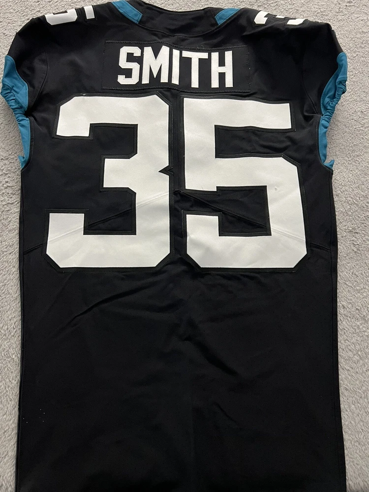 Nike size 40 from the 2019 season. Has the NFL 100 logo as well as the 25th anniversary logo. Issued to Savion Smith.