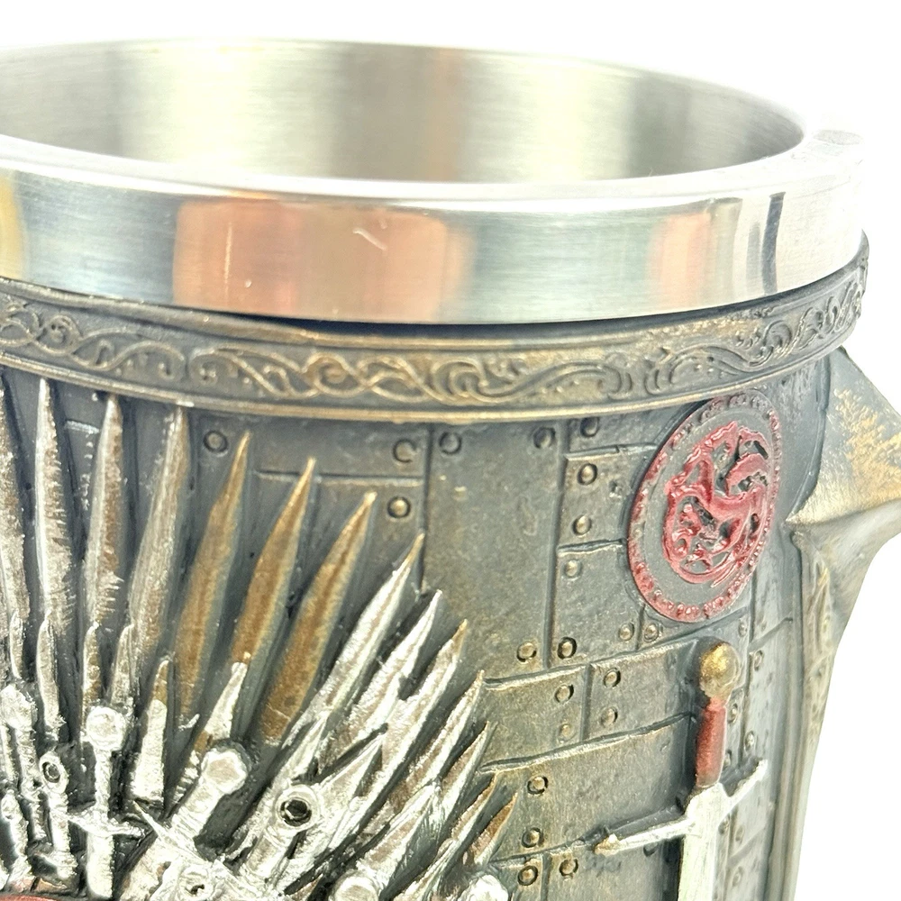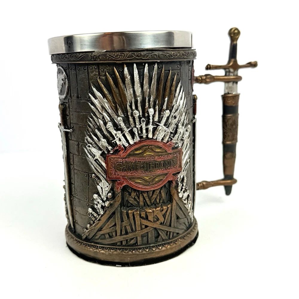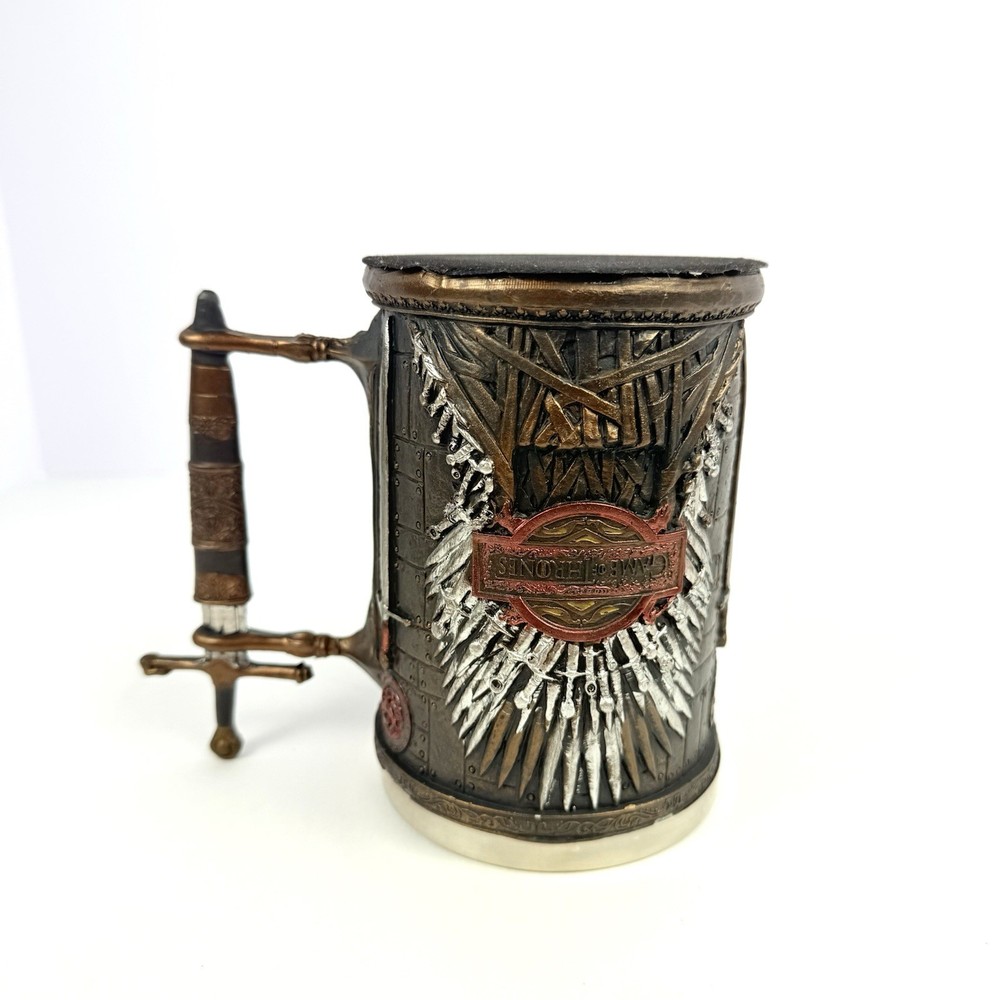 Never used. Game Of Thrones Official Merchandise: Iron Throne Tankard Only the mighty can drink from the Game of Thrones Iron Throne Tankard. Beer, water, milk, coffee (it is suitable for hot and cold drinks) — no matter your beverage of choice — you’ll look stronger when you’re drinking out of this detailed tankard. As you can see in the pictures, this officially licensed Game of Thrones Tankard is highly detailed and features a raised Iron Throne and the Game of Thrones logo on each side. It is cast in ast in the highest quality resin and is painstakingly hand-painted. Besides for the Iron Thrones, there are details thoughout such as the handle that is formed from a sword. See last photo there is a small gap between stainless steel and resin I want you to be aware of. Measures 5.5” high, 6.5” wide at handle and 3.5” diameter opening. Let me know what questions you have. Blessings to you! 🤎🩶🖤🧡🖤🩶🤎