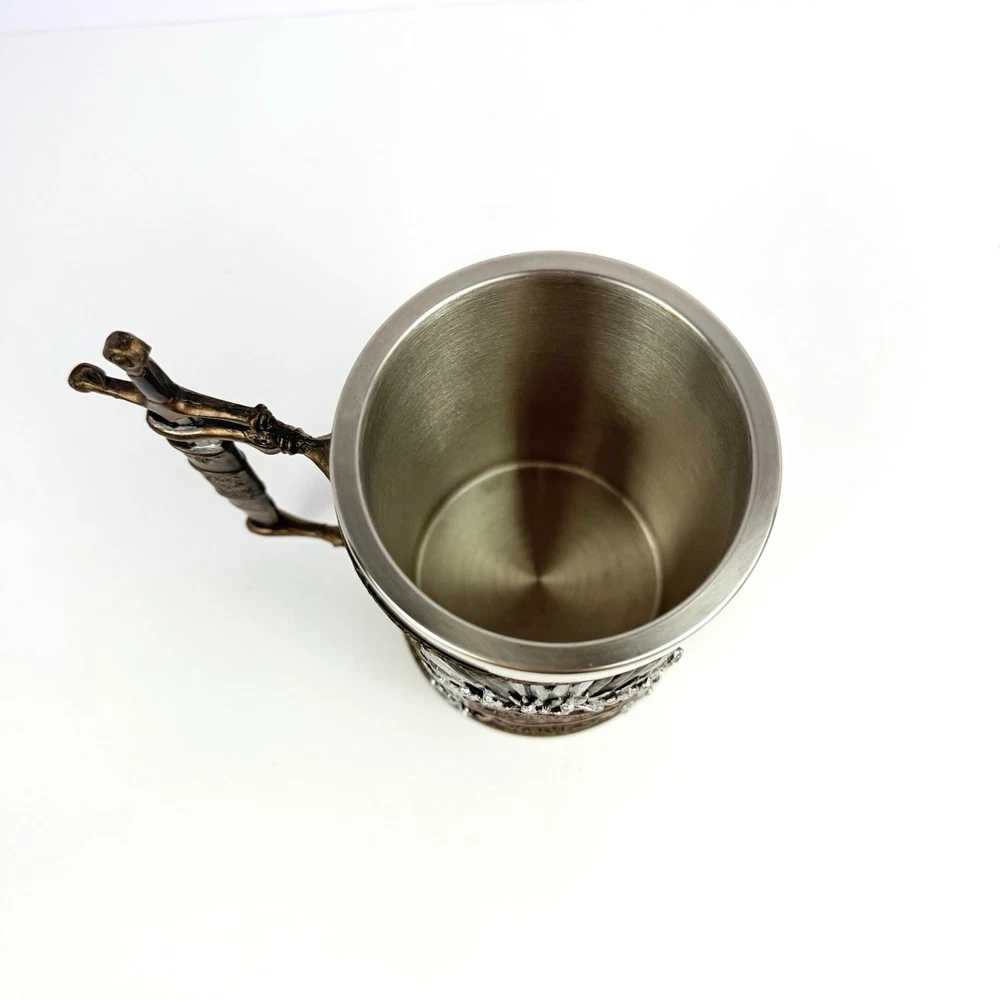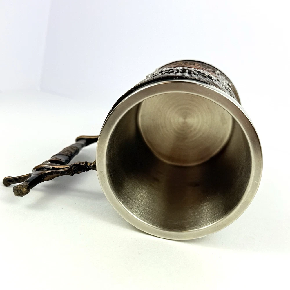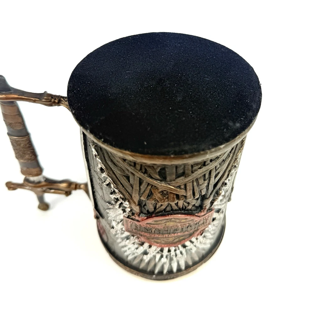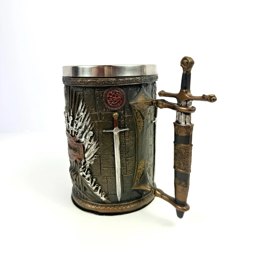 Never used. Game Of Thrones Official Merchandise: Iron Throne Tankard Only the mighty can drink from the Game of Thrones Iron Throne Tankard. Beer, water, milk, coffee (it is suitable for hot and cold drinks) — no matter your beverage of choice — you’ll look stronger when you’re drinking out of this detailed tankard. As you can see in the pictures, this officially licensed Game of Thrones Tankard is highly detailed and features a raised Iron Throne and the Game of Thrones logo on each side. It is cast in ast in the highest quality resin and is painstakingly hand-painted. Besides for the Iron Thrones, there are details thoughout such as the handle that is formed from a sword. See last photo there is a small gap between stainless steel and resin I want you to be aware of. Measures 5.5” high, 6.5” wide at handle and 3.5” diameter opening. Let me know what questions you have. Blessings to you! 🤎🩶🖤🧡🖤🩶🤎