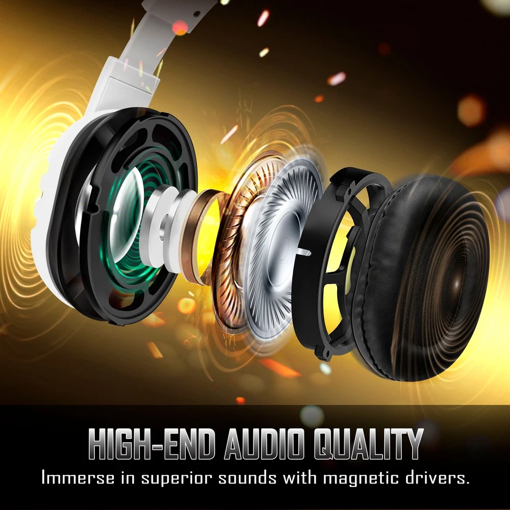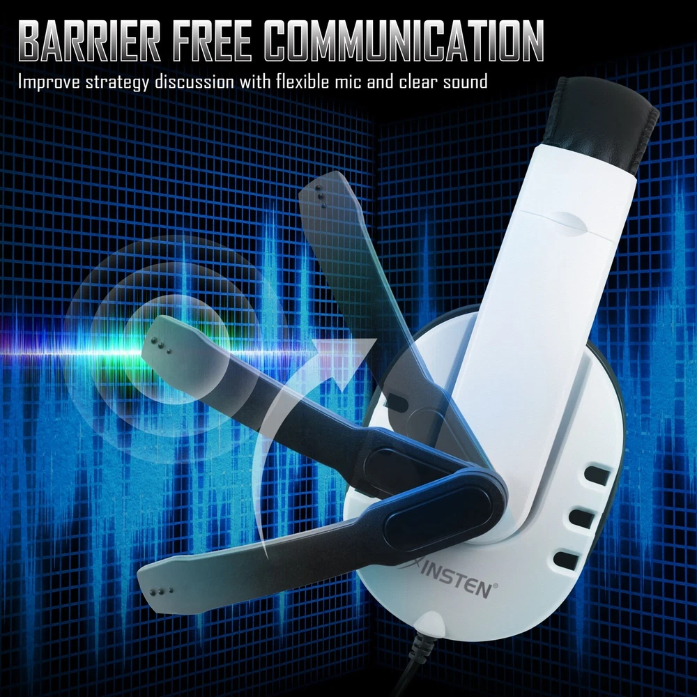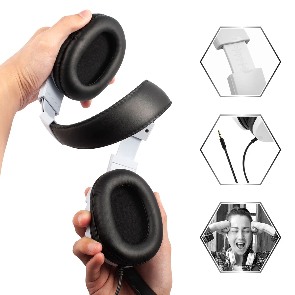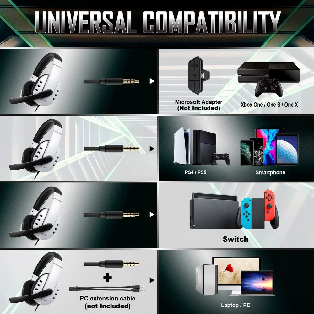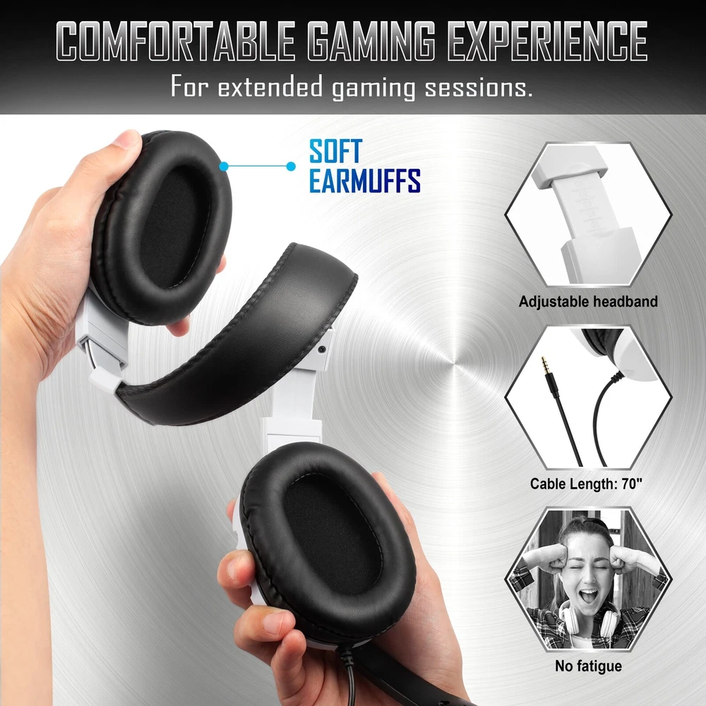 eForCity Immerse yourself in the ultimate gaming experience with this multi-platform gaming headset. Compatible with PS5, PS4, Nintendo Switch, Xbox Series X/S, Xbox One, PC, laptop, tablet, cell phone, TV, and other devices with a 3.5mm audio jack. Please note, an additional adapter (Not Included) is required for older Xbox controllers. Enjoy superior sound quality with over-ear headphones featuring a magnetic driver for capturing every detail, from atmospheric sounds to stealthy footsteps. Gain a competitive edge with accurate sound positioning and 3D stereo sound, delivering crisp highs and deep bass for an immersive gaming experience. Communicate clearly with the built-in high-sensitivity microphone that cancels out background noise, allowing for strategic discussions. The flexible mic adjusts easily for in-game and online chats. Designed for comfort, the lightweight headset features soft memory protein earmuffs and a stretchable metal headband for extended wear. The 5.8 feet cable offers flexibility and durability. The package includes a white 3.5mm wired gaming headset with a microphone. Connect effortlessly to multiple devices for an immersive gaming experience across platforms. Use this universal headphones for gaming, music, movies, and more. Elevate your gaming with this versatile headset, providing superior sound, clear communication, and comfort. Get ready for epic adventures with this 3.5mm wired gaming headset. Additionally, PCs with sound cards that have separate microphone and speaker connections, identified by pink and green plastic around the jack, require a 3.5mm TRRS splitter adapter (not included). Gaming Headset with Mic for PS5 PS4 xBox Series X/S Switch PC, Wired 3.5mm White Multi-Platform Compatibility: This gaming headset is compatible with PS5, PS4, Nintendo Switch, Xbox Series X/S, Xbox One, PC, laptop, tablet, cell phone, TV, and other devices with a 3.5mm audio jack connection. Please note that an additional adapter (Not Included) is required for older version Xbox controllers. Additionally, PCs with sound cards that have separate microphone and speaker connections, require a 3.5mm TRRS splitter adapter (not included). Superior Sound Quality: This over-ear gaming headphones with a mic is constructed with a magnetic driver, capturing all sounds from the atmosphere to the stealthiest footsteps, giving a competitive advantage in gaming. Accurate sound positioning enhances realism, optimizing moves and reflexes during attacks, aiding in winning the game. This wired headphones with a microphone deliver 3D stereo sound, with crisp highs and deep, hard-hitting bass, making them perfect for various games Crystal Clear Chat: This wired headphones has a built-in high-sensitivity microphone with effective noise cancellation to ensure clear communication. It automatically recognizes the human voice and filters out environment noise, providing you with the best discussion of strategy with other players. The flexible mic is designed for convenient adjustment of the microphone angle during in-game and online chat Lightweight & Comfortable Design: This gaming headset with a mic features soft memory protein earmuffs on both sides, which are gentle enough for long hours of gaming. The lightweight and stretchable metal headband provides balanced pressure on the head and superb comfort for extended periods of wear. The 5.8 feet cable ensures flexibility and durability What's Included: White 3.5mm wired gaming headset with a microphone. This universal over-ear headphones connect effortlessly to multiple devices, allowing you to enjoy an immersive gaming experience across platforms. This 3.5mm wired headphones can also be used for listening to music or watching TV and movies
