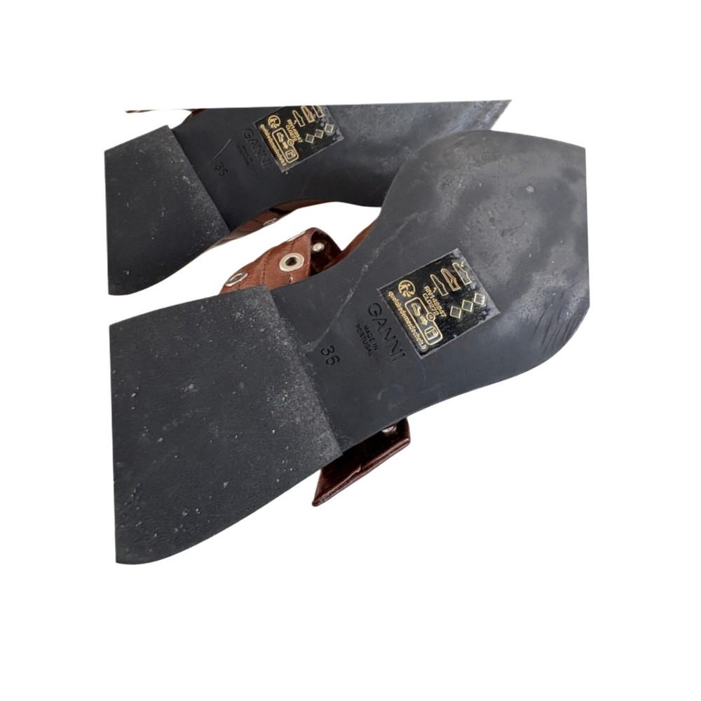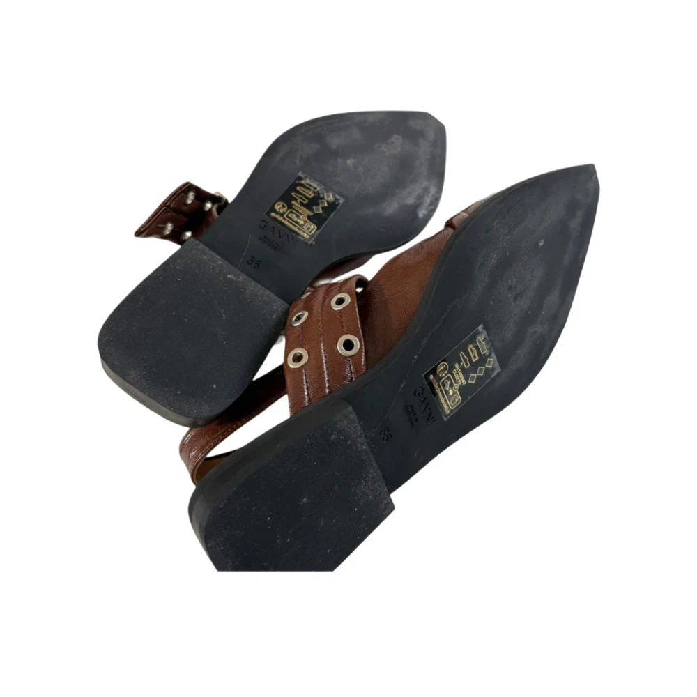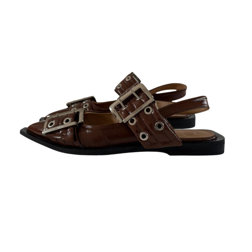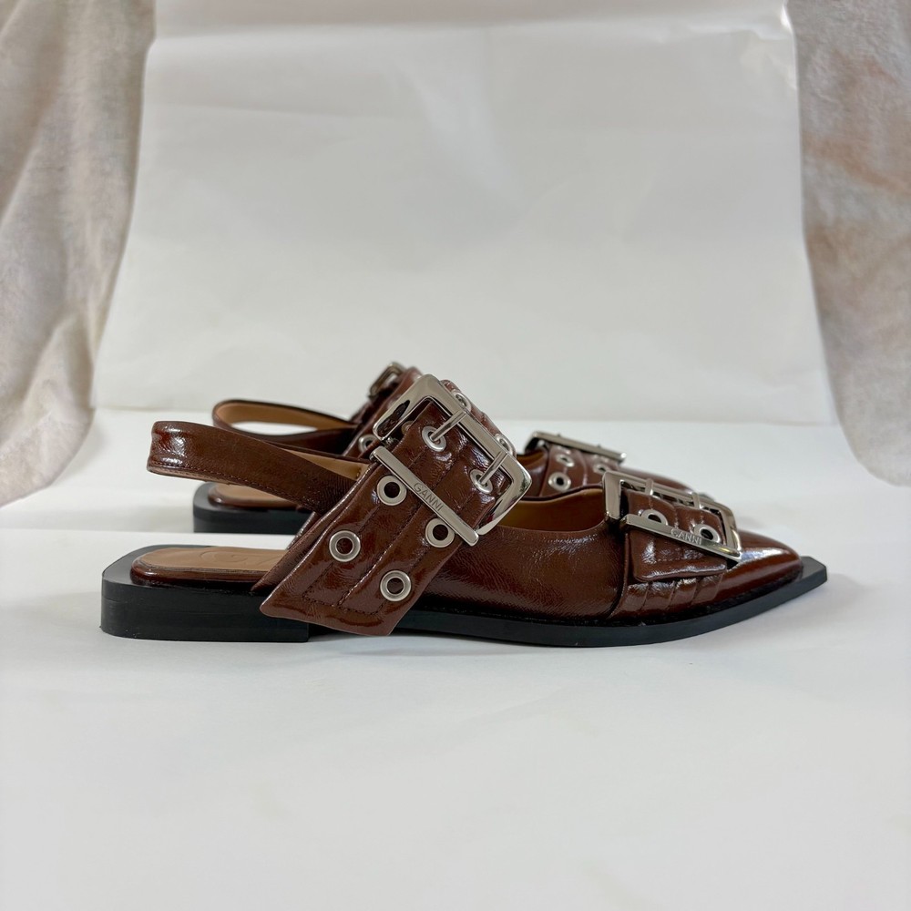 Color: Brown Type: Flat Country of Origin: Portugal Upper Material: Leather EU Shoe Size: 36 Features: Buckle US Shoe Size: 6 Accents: Buckle Department: Women Insole Material: Leather Style: Slingback Toe Shape: Pointed Toe Occasion: Casual, Formal, Travel, Workwear Outsole Material: Leather Seller Notes: “Very good” Lining Material: Leather UK Shoe Size: 3.5 Brand: Ganni Season: Summer Closure: Buckle