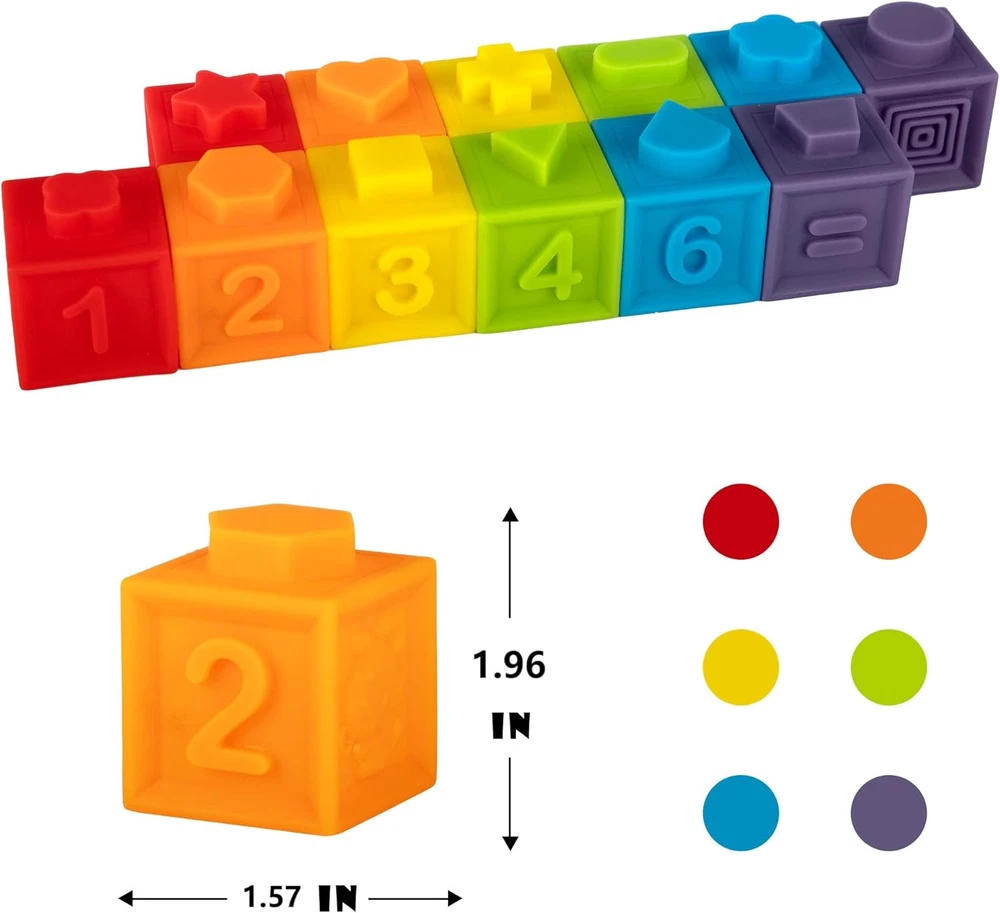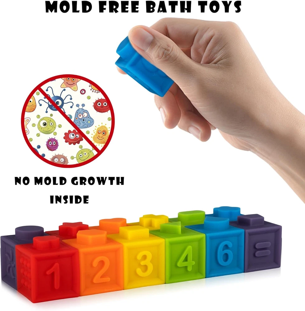 Soft Stacking Block : Baby Montessori Toys include 12 pcs mini soft and squeezable blocks. Each block has fun color, number, animal and shape. suitable for 6 month up baby Easter egg fillers for babys,toddlers Easter basket stuffers for toddlers Baby Gifts Stocking Stuffers : Soft stacking blocks and easy to squeeze for babies and toddlers to play, making a squeak sound. These baby building blocks are soft, durable and easy to be picked up and stacked together by babys hand. Stocking Stuffers Montessori Toys for Infant Toys For Toddlers Gifts :This colorful soft stacking blocks set is a great multi-purpose toy for babies. It is soft, chewable and perfect for the baby who is aged 6 months and just gets their first teeth. It can also be used as a bath toy, can float on the water and squeeze to spray water. Stocking Stuffers Building blocks for babies Gifts 6-12 months : Mini Montessori Toys come in a cute packing, stocking stuffers for babys, boys and girls, soft block for babies 6-12 months.Easter egg fillers for babys,,toddlers Easter basket stuffers for toddlers No bad odor or chemical smell : If you not satisfied with your purchase, just let us know so we can give you a refund or replacement. Product Description 12PCS MOLD FREE BABY BATH TOY SET If you're looking for a bath toy that won't get in water, mold, and endanger your child's health, then this is what you're looking for. Recognizing the potential dangers of squirting bath toys, developed a mold-free bath toy that combines the advantages of non-absorbent, non-toxic, baby-friendly, and more Our bath toys make great gifts for babies and children, party favors, and birthday decorations. Use your imagination or let your kids create their own world with our fun and colorful bath toys. No Hole Design Ganowo bath toys are designed with materials and construction mold free, ensuring your child's safety during play Easy to Clean Say goodbye to the hassle of cleaning and drying toys after every bath. Mold free bath toys are a breeze to maintain, giving you more quality time with your little one Variety and Fun Ganowo mold free bath toys come in a range of exciting shapes and colors, providing endless entertainment and promoting sensory development during bath time Will the mold free bath toys safe? Made of non-toxic and odorless sanitary resin PVC, which can directly contact with the baby's skin. Why a hole in the bottom and seal with glue? The production process caused a hole in the bottom, and the epoxy glue solved this problem perfectly. What are the benefits of toys with no holes? Safety - Toys without holes eliminate the risk of small parts becoming detached and posing a choking hazard, making them safer for children of all ages. Are these suitable for infants 6-12 months old? Yes, these bath toys are suitable for infants 6-12 months old as well as toddlers aged 1-6 years old. Do these toys promote hand-eye coordination? Yes, these bath toys can help promote hand-eye coordination in young children as they grasp, manipulate and interact with the different animal figures during play. The bright colors and cute shapes also stimulate visual senses.