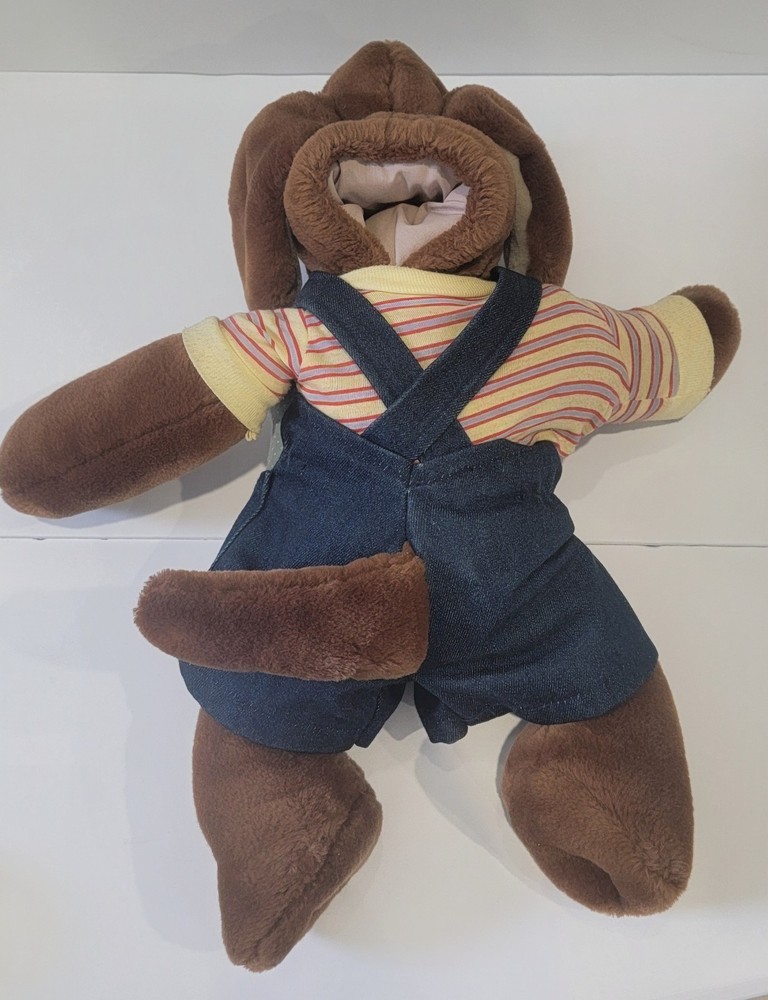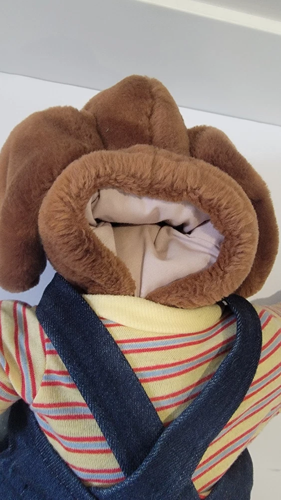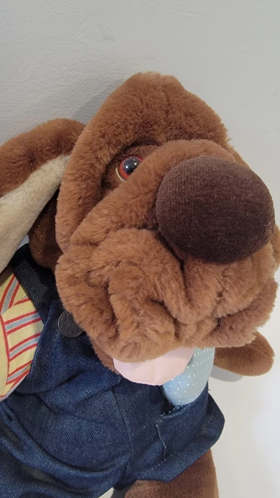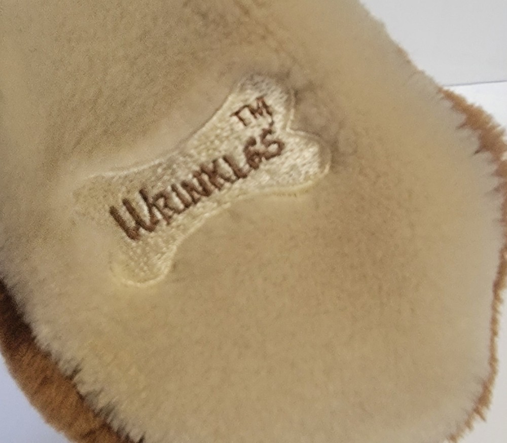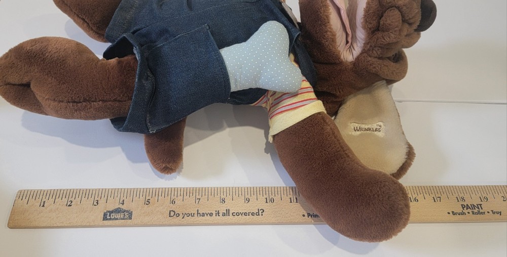Pre-owned no holes or stains Smoke-free home Ganz Bros. Wrinkles the Dog hand puppet. This vintage Ganz Bros Wrinkles the Dog hand puppet plush is a cherished collectible for any fan of stuffed animals. With its adorable overalls and striped shirt, this medium-sized (14-24 inches) puppet is perfect for children aged 4-16 or collectors of all ages. Made in 1981, this toy is a nostalgic reminder of a simpler time. The puppet wears overalls and a striped shirt, and is made of plush material along with its stuffed bone. no voice mechanism