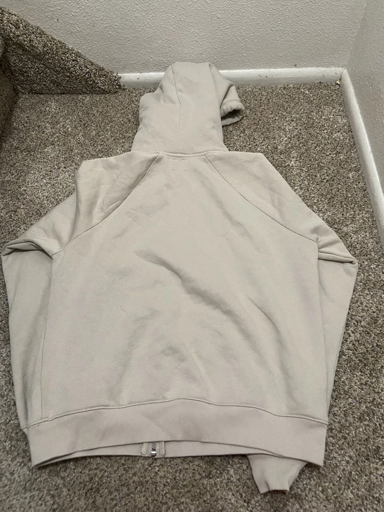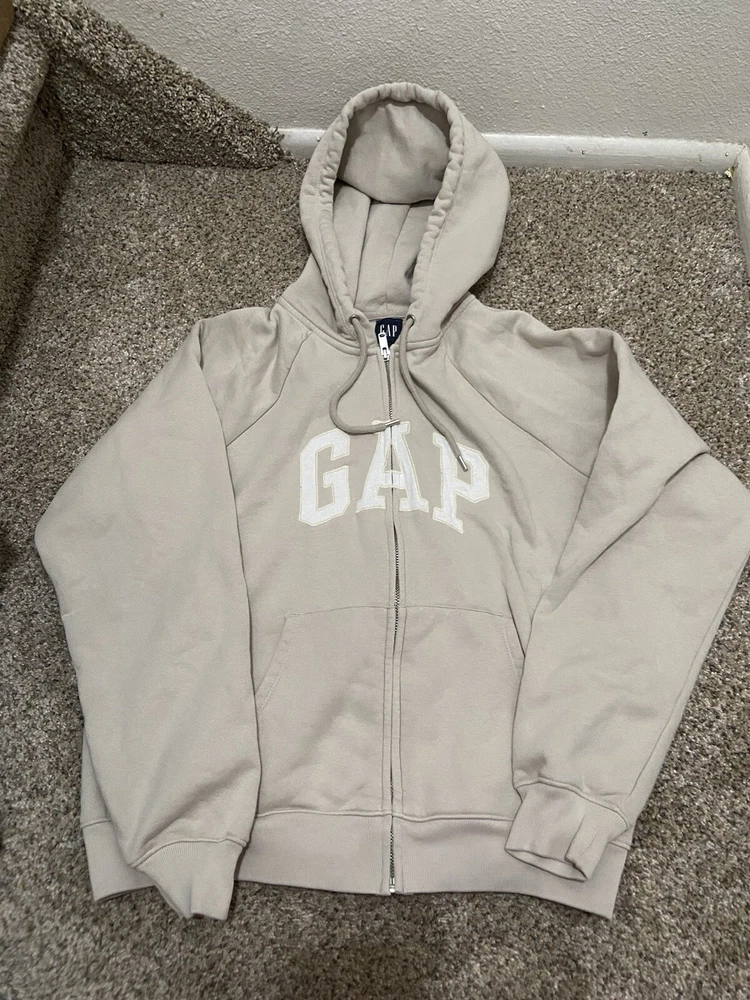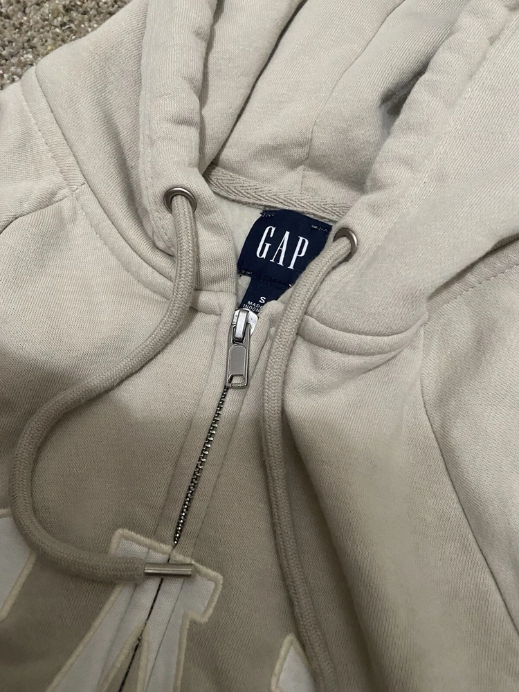 Elevate your activewear game with this Gap beige arch logo zip hoodie. The long sleeve sweatshirt boasts a full zip closure and is made of a comfortable polyester, cotton, and cotton blend jersey fabric. It features a solid pattern with logo accents and is machine washable for easy care. This hoodie is perfect for any occasion and is available in size small. Great condition