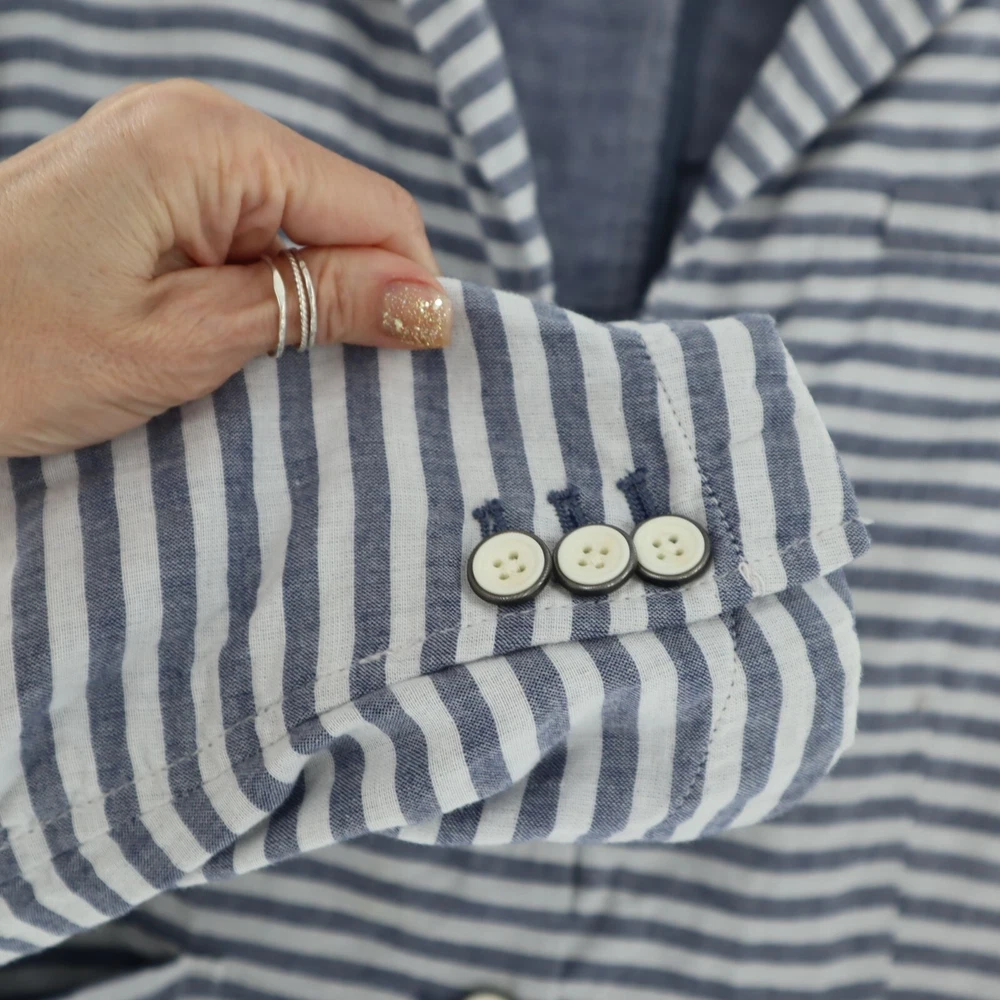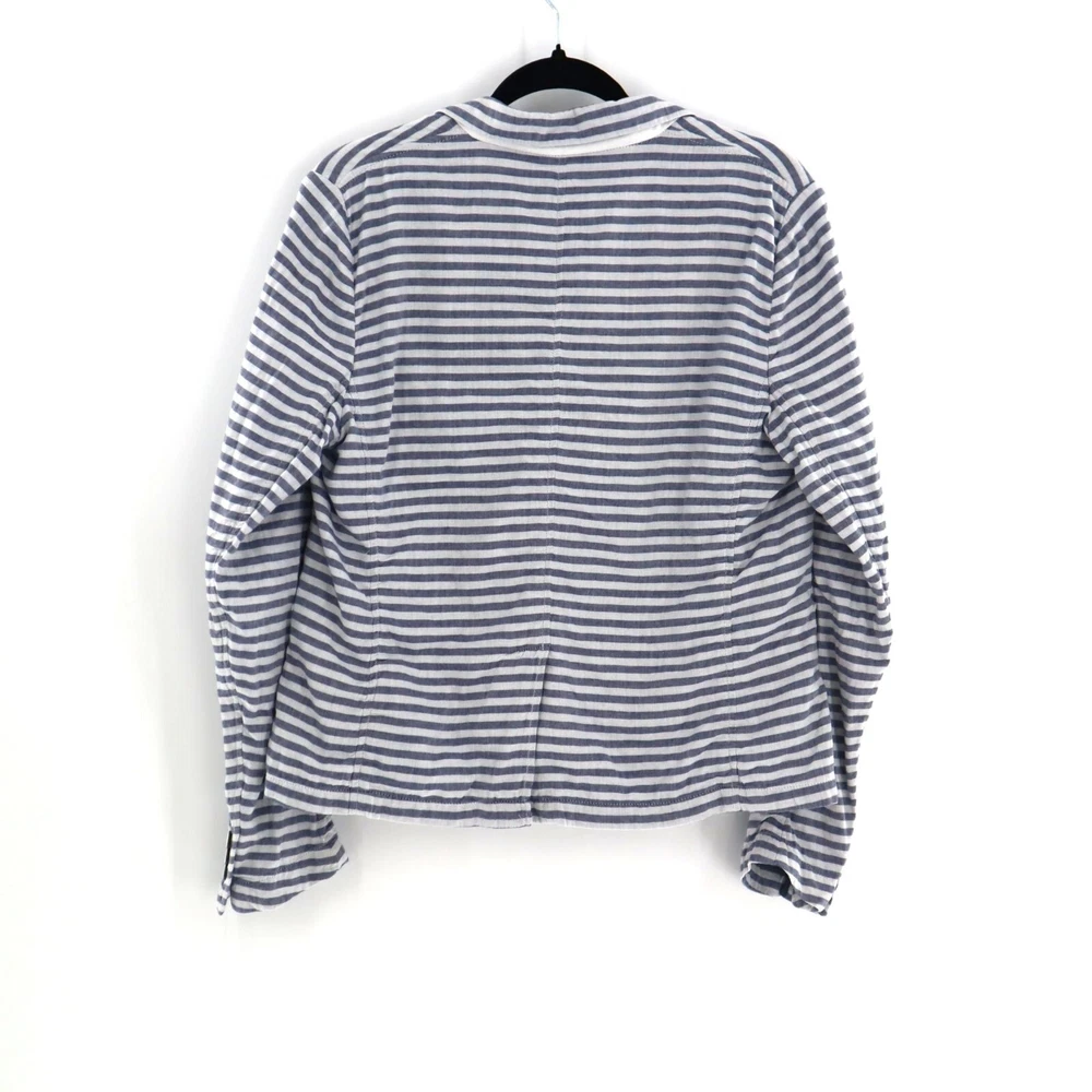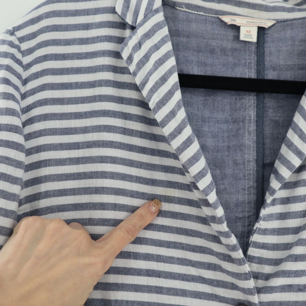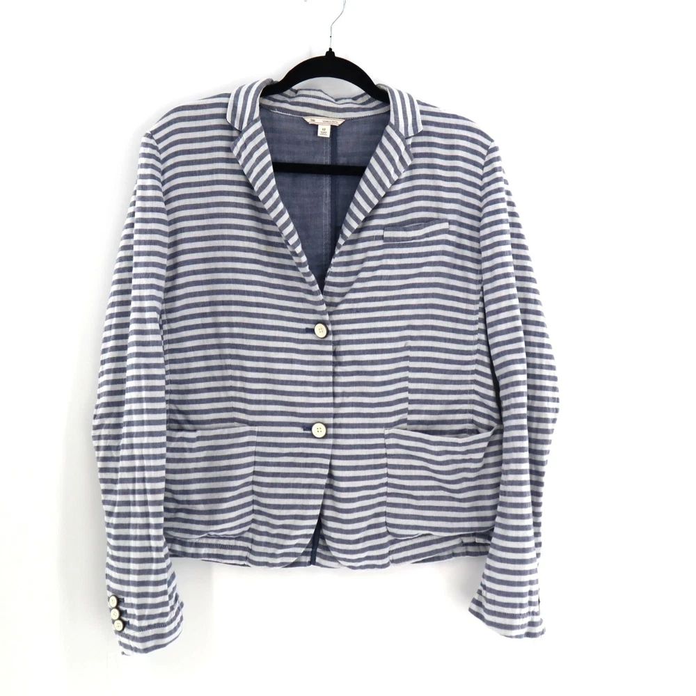 Gap Cotton Striped Muslin Blazer Womens Size 12 Casual Lightweight Coastal Beach This Gap Cotton Striped Muslin Blazer is a perfect blend of comfort and style. Featuring a two-button front, back vent, and two pockets, this lightweight blazer is ideal for beachy, coastal travels. • Brand: Gap • Size: Womens 12 • Color: Blue, White • Pattern: Stripes • Material: Cotton • Two-button front • Back vented • Two pockets • Lightweight • Style: Coastal, Beachy, Travel Features: • Coastal, Beachy, Travel, Lightweight • Spring, Summer • Stripes • Made in India • Machine Wash Size: Womens 12 Measurements: Length from center back 23.5 in / 60 cm Bust flat lay 20.5 in / 52 cm Sleeve from neckline 28 in / 71 cm Sleeve from shoulder 24 in / 61 cm Condition: Pre-Owned Good GUC with a faint stain on the front, as seen in photo.