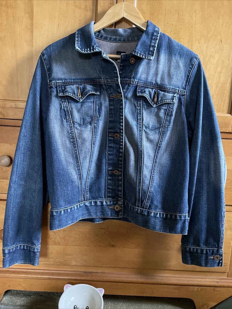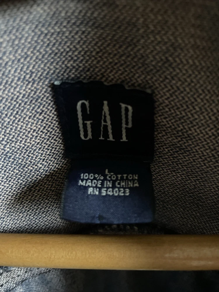 This Gap denim jacket is a must-have for any wardrobe. It features a lightweight and collared design with pockets for added convenience. The jacket is made of cotton and is perfect for both fall and spring seasons. The blue color and basic jacket style make it versatile and easy to pair with any outfit. The jacket also has a unique accent with a T-shirt sewn on the back, adding a touch of personality to the piece. This jacket is perfect for anyone who loves a casual and chic look.