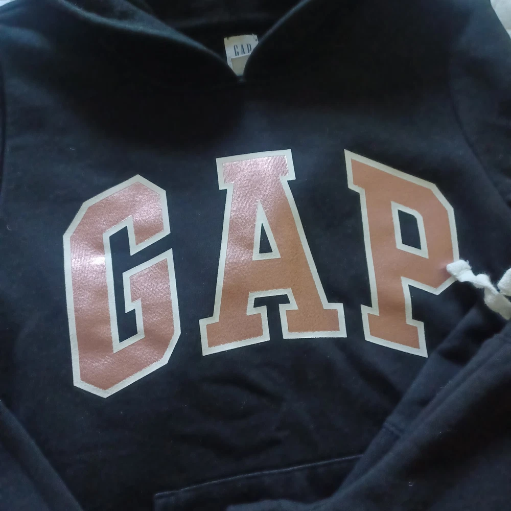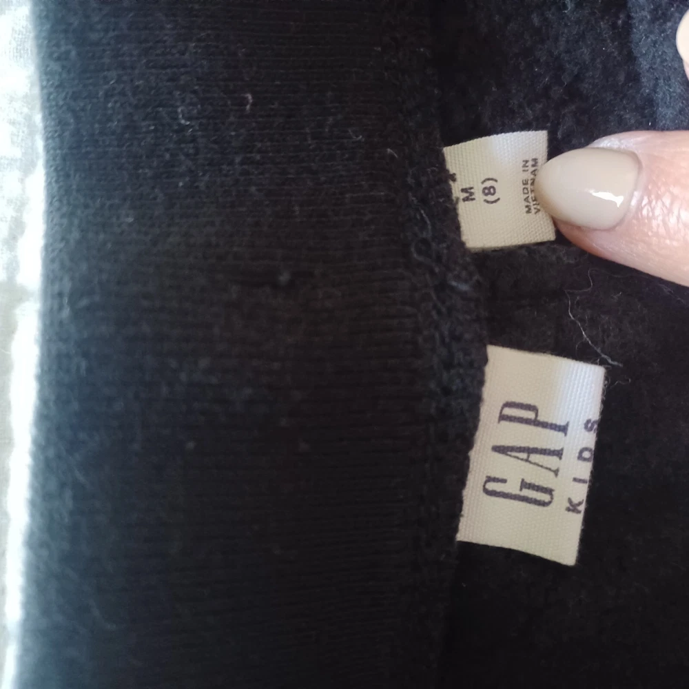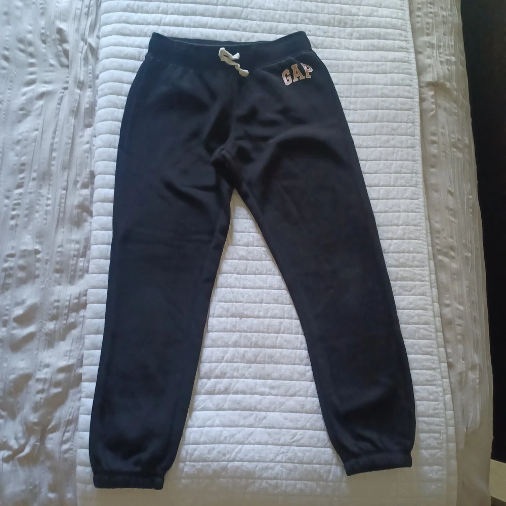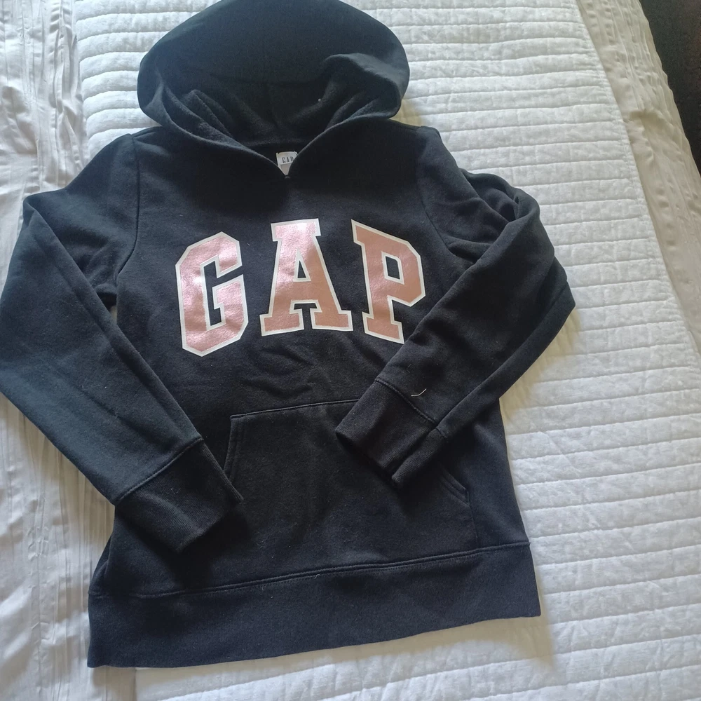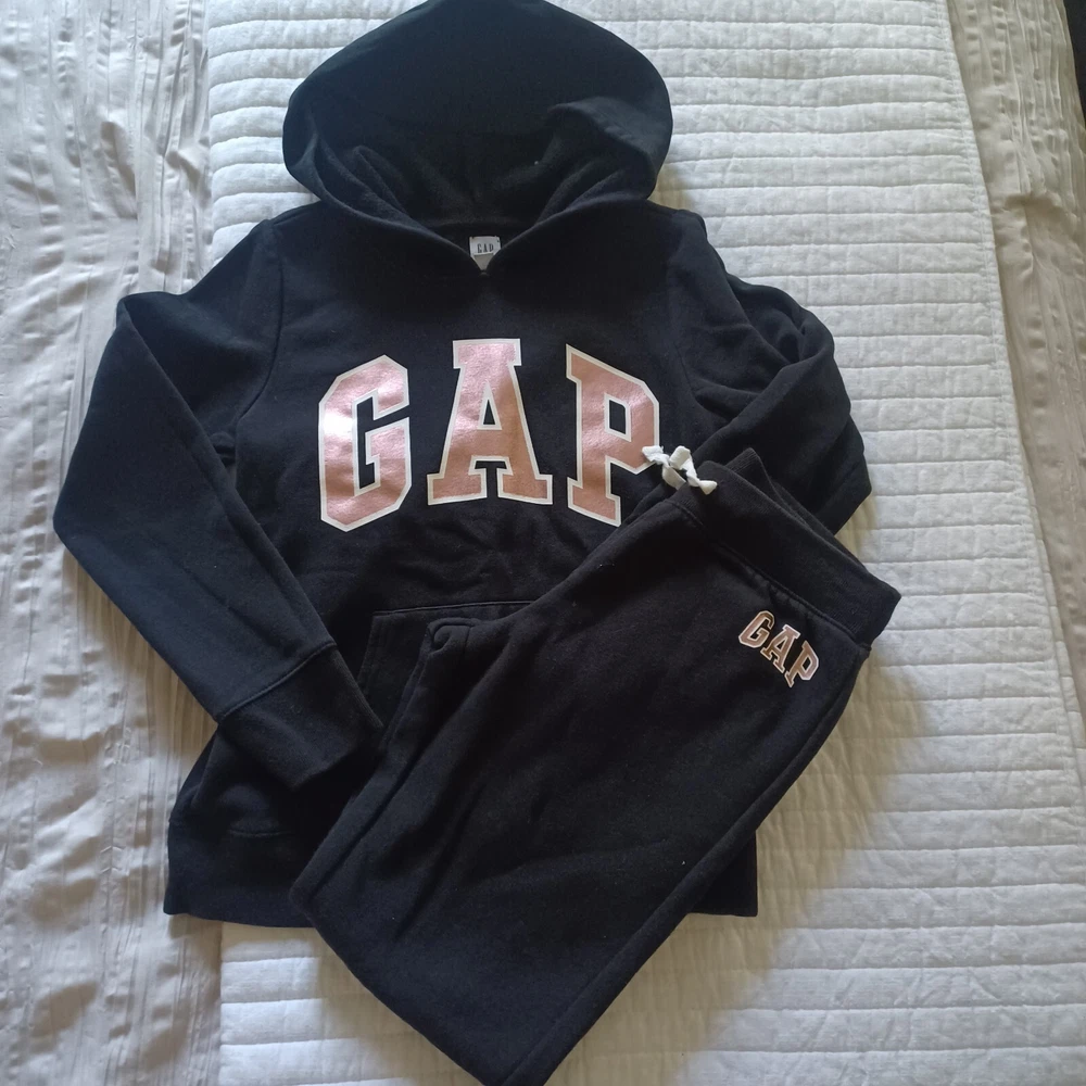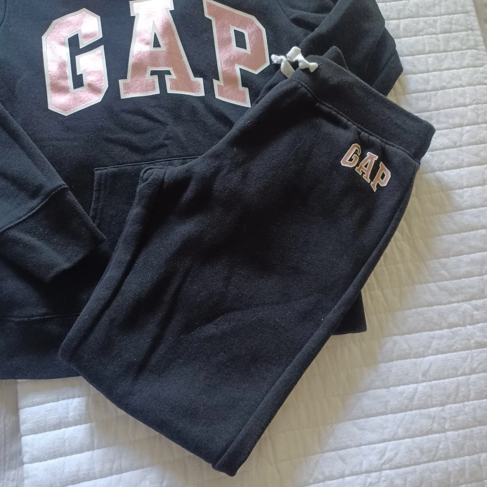 Gap pullover hooded sweat shirt, kangaroo pocket. Jogger style sweatpants with GAP logo at the hip. Black and metallic pink letters. size 8 girls. excellent used condition. smoke free and pet free home.