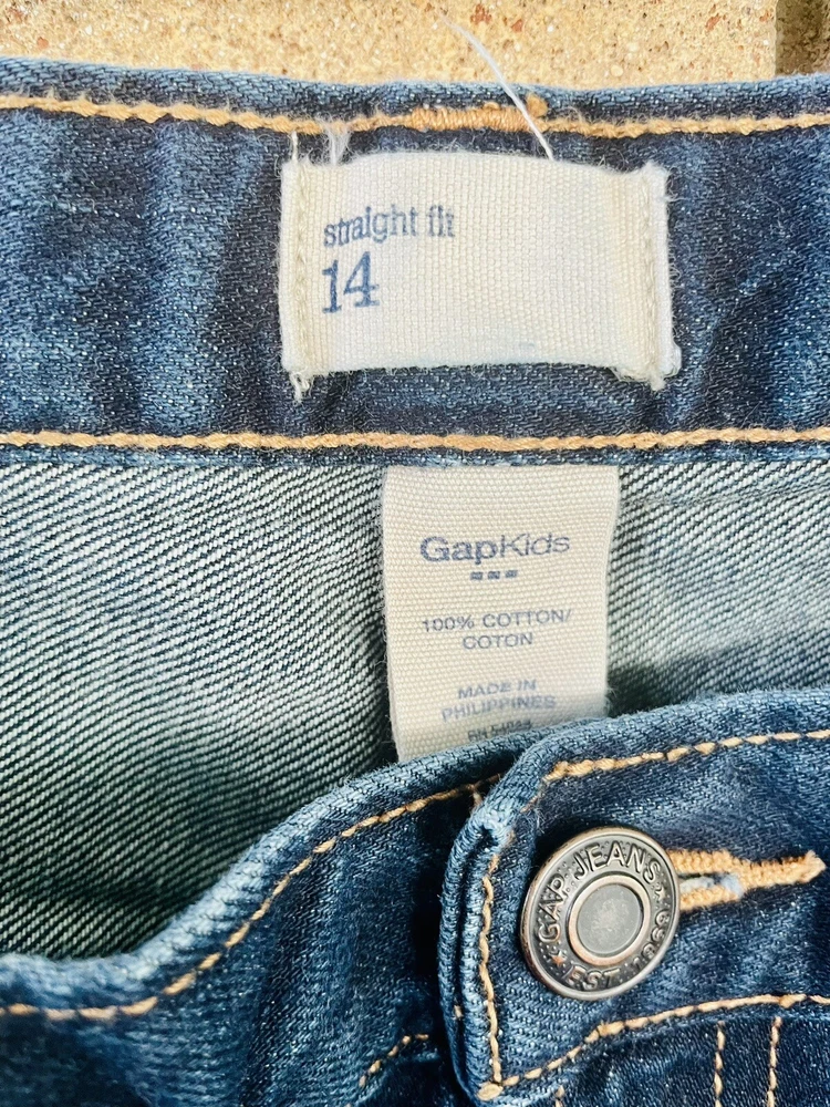 Pattern: Solid Waist Size: 27 in Type: Jeans Brand: Gap Performance/Activity: School, Walking Style: Straight Character: Boy Closure: Zip, Button Occasion: Casual Fabric Type: Denim Theme: American Garment Care: Machine Washable Inseam: 28 in Color: Blue Vintage: No Size: 14 Department: Boys Country/Region of Manufacture: Philippines Fabric Wash: Dark Handmade: No Material: 100% Cotton Fit: Regular