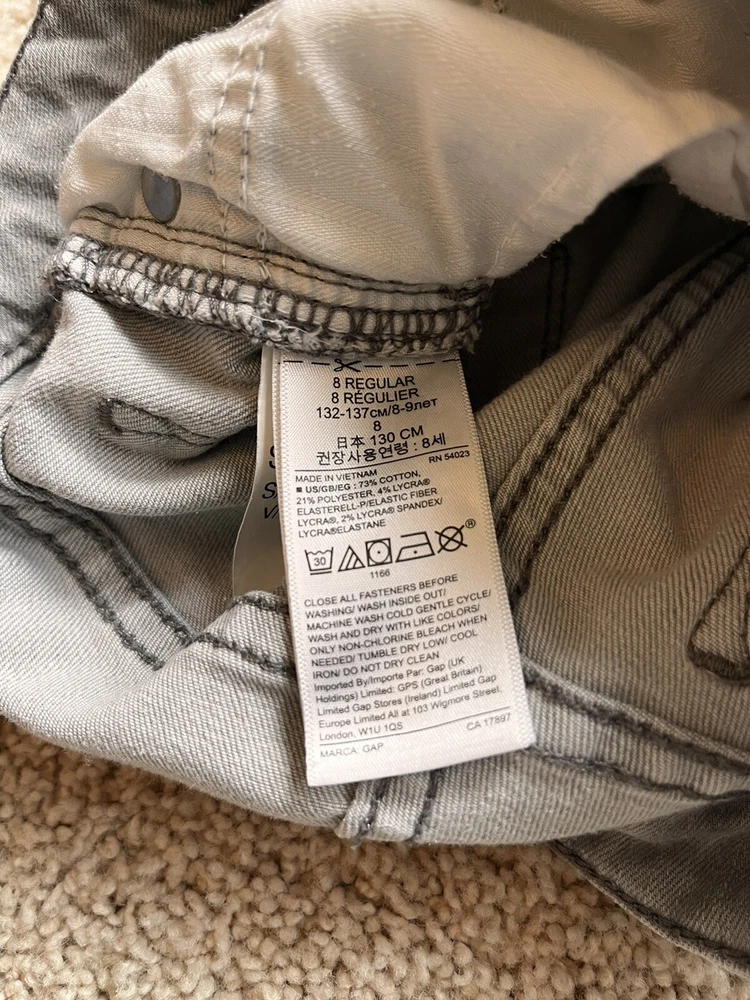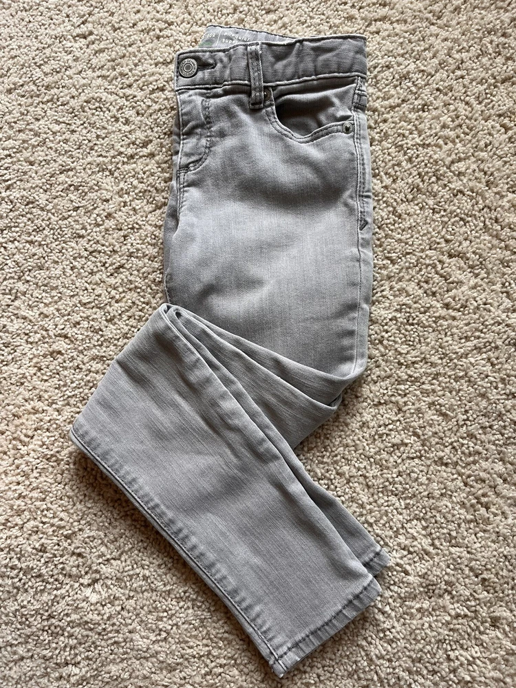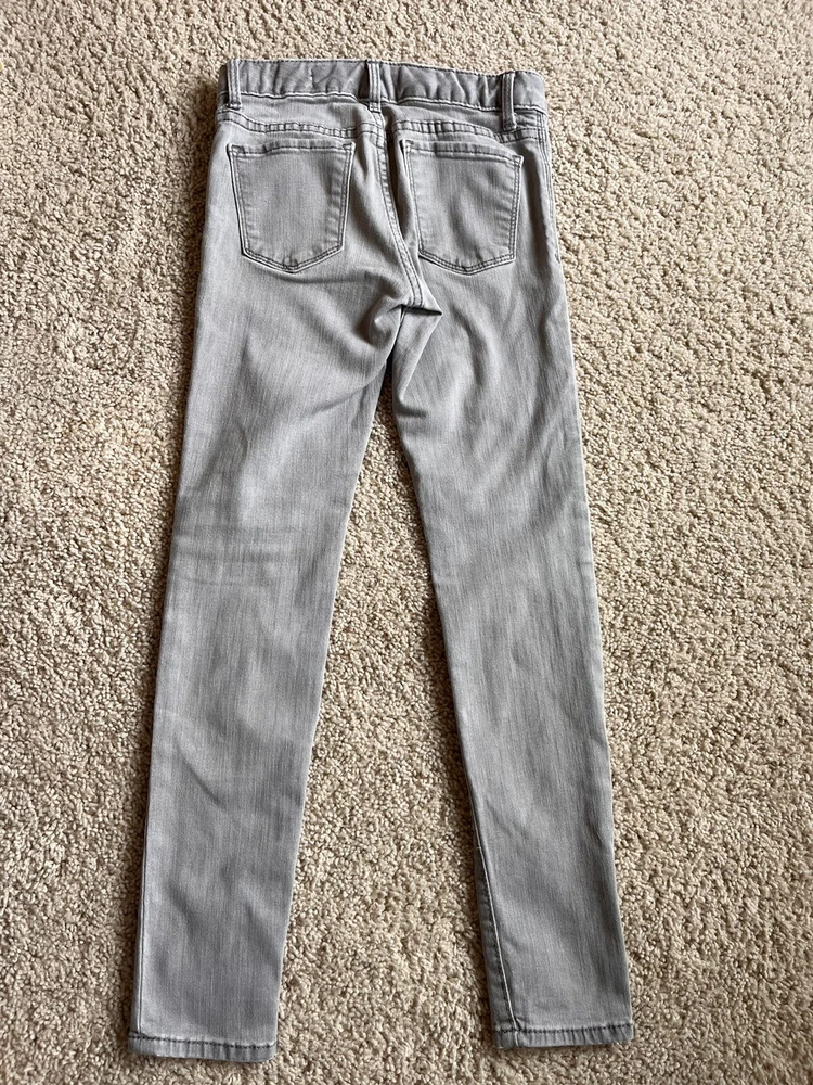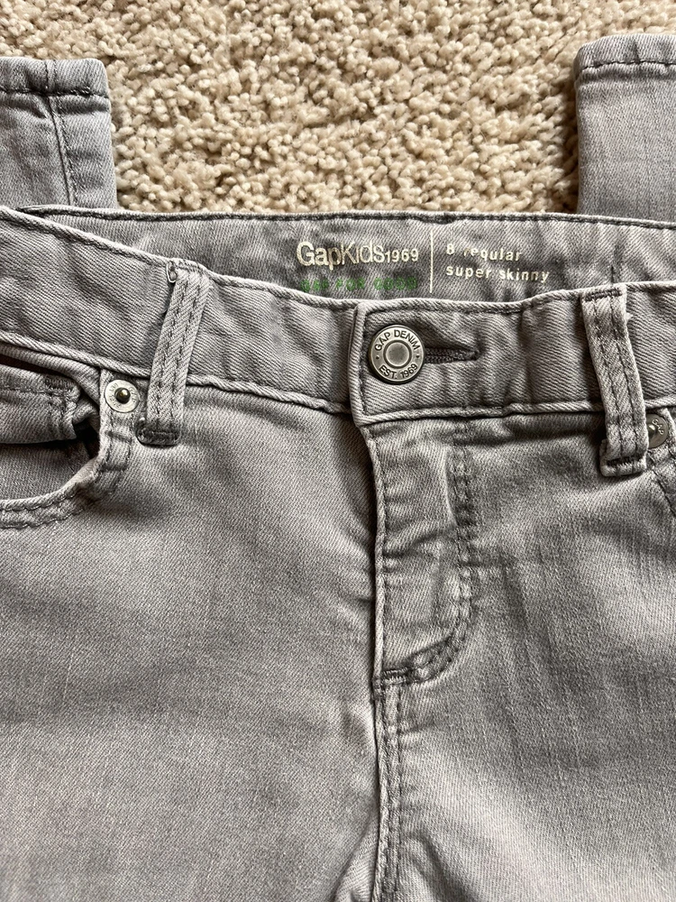 Theme: Classic Department: Girls Inseam: 23.5 in Occasion: Casual, Travel Accents: Button Season: Fall, Spring, Winter Fabric Type: Denim Vintage: No Fabric Wash: Light Pattern: Solid Brand: Gap Fit: Regular Style: Skinny Color: Gray Features: Adjustable Waist, Stretch Waist Size: 24 in Rise: Mid Garment Care: Machine Washable Size: 8 Type: Jeans Closure: Zip Performance/Activity: Play, School Model: Gap Kids Stretch Super Skinny