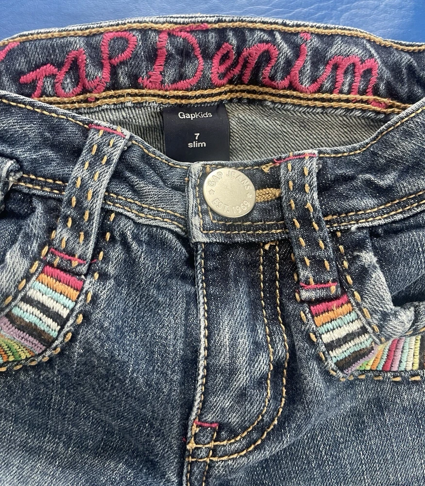 Gap Kids Girls Blue Distressed Jeans Straight 7 Slim. Condition is Pre-owned. Shipped with USPS Ground Advantage.