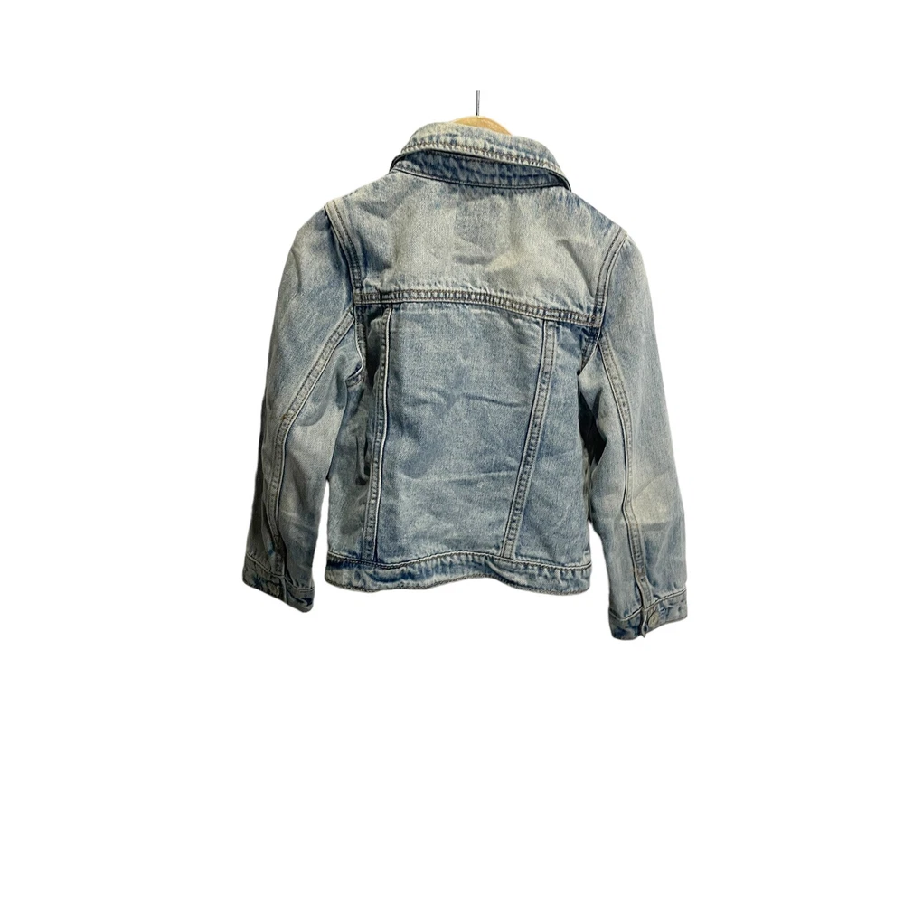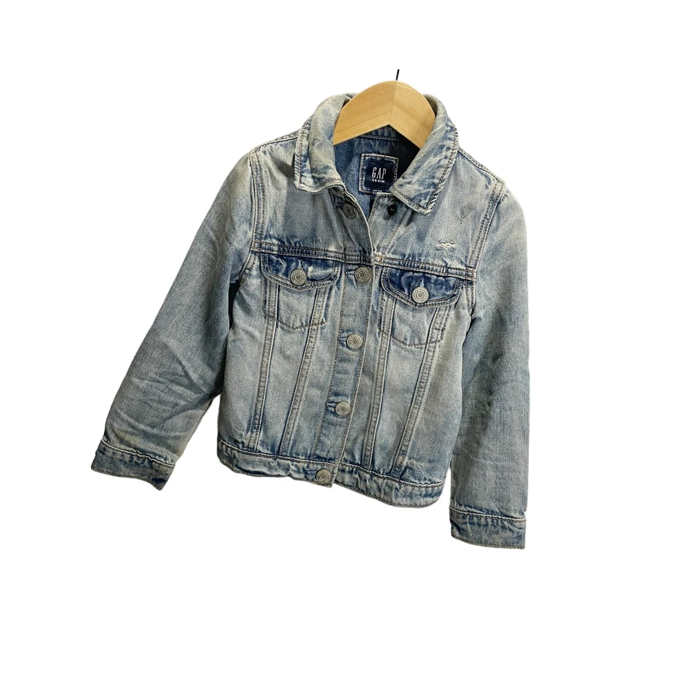 This trendy blue denim jacket made by Gap Kids is perfect for your little fashionista. The jacket features a bomber style with a collared neckline, long sleeves, and a snap front closure. It has a solid pattern and is made of 100% cotton outer shell material with cotton lining material, making it comfortable to wear in any season. The jacket is machine washable and has pockets, making it a practical choice for casual occasions. It is a regular fit with a chest size of 25 and size 5. The jacket has a stretch feature and is not handmade. This stylish denim jacket is suitable for girls aged 5 years and is perfect for winter, summer, fall, and spring.