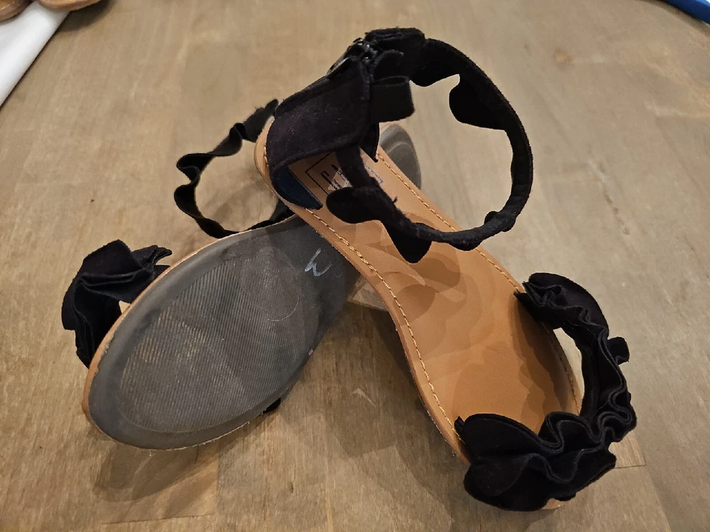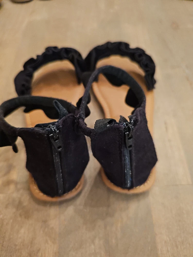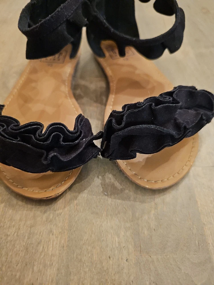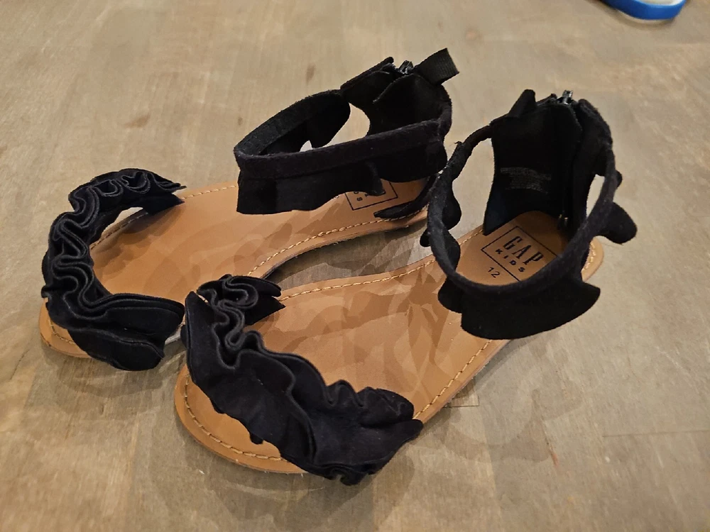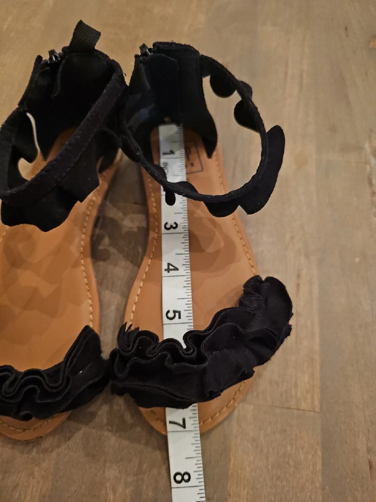 Gap Kids Girls Sz 12 Black ruffle sandals back zip Ankle Strap Very Good Cond. Faux suede. There is a little scuff on each toe, and the bottom looks walked on. Otherwise, these look new. Very nice, cute sandals. From smoke free home. Happy to combine shipping on multiple purchases.