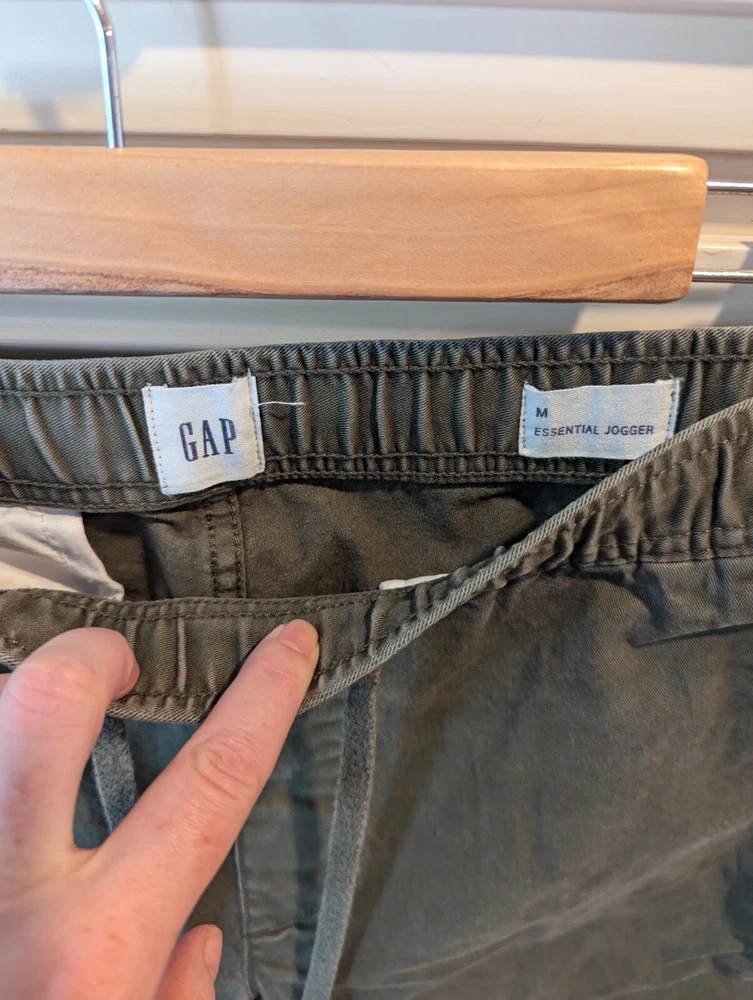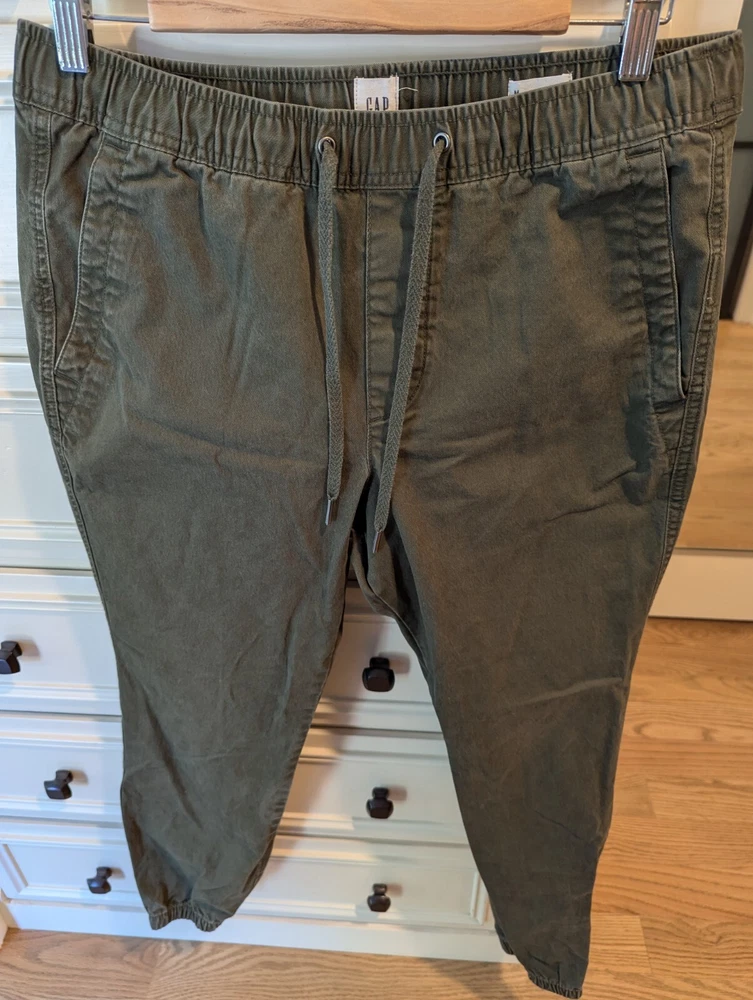 Pocket Type: Slash Pocket Closure: Drawstring Pattern: Solid Waist Size: Medium Department: Men Accents: Jogger Inseam: 29 in Vintage: No Year Manufactured: 2010-2019 Fit: Slim Material: 98% Cotton/ 2% Spandex Handmade: No Type: Jeans Model: Gap Product Line: Gap Size: M Size Type: Regular UPC: Does not apply Distressed: No Personalize: No Fabric Type: Canvas Rise: Mid (10-12 in) Style: Tapered Color: Olive Green gtin13: Does not apply Country/Region of Manufacture: Indonesia Theme: American, Classic, Designer Fabric Wash: Medium Features: Comfort, Easy Care, Lightweight, Pockets, Stretch Brand: Gap Garment Care: Machine Washable Season: Fall, Spring, Summer