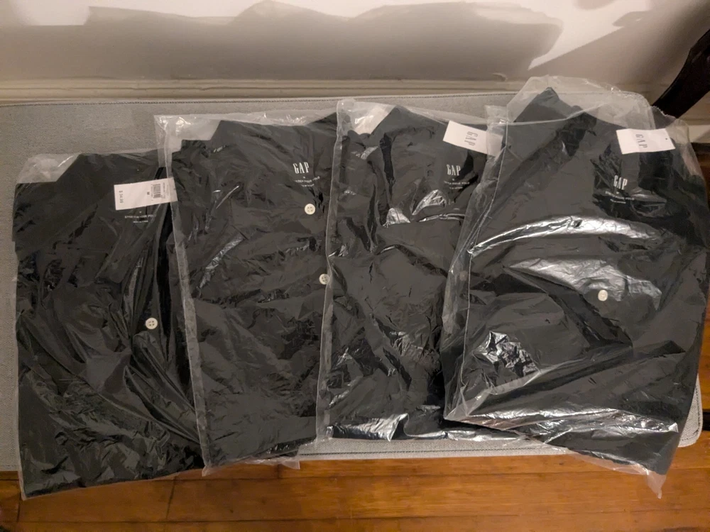 New with tags. Elevate your wardrobe with this stylish Gap polo shirt in true black. The button neck collar and stretch feature add a touch of sophistication to this versatile piece, perfect for travel, casual outings, or business meetings. Made with moisture-wicking technology, this polo shirt keeps you comfortable and dry throughout the day. The size M fits regular men's sizes and is suitable for any occasion. The brand Gap is known for its quality and style, making this polo shirt a great addition to your collection.