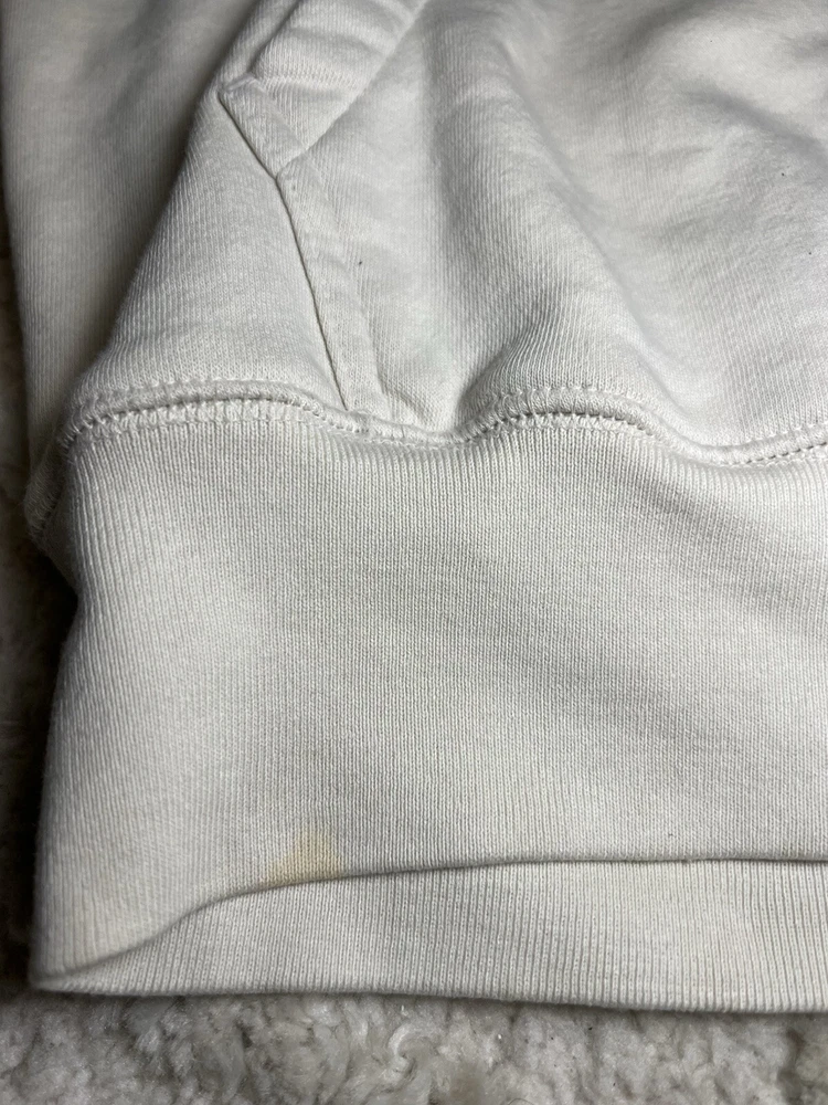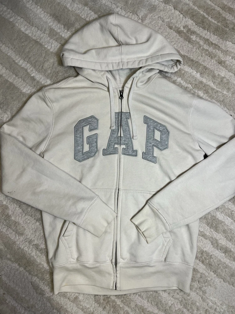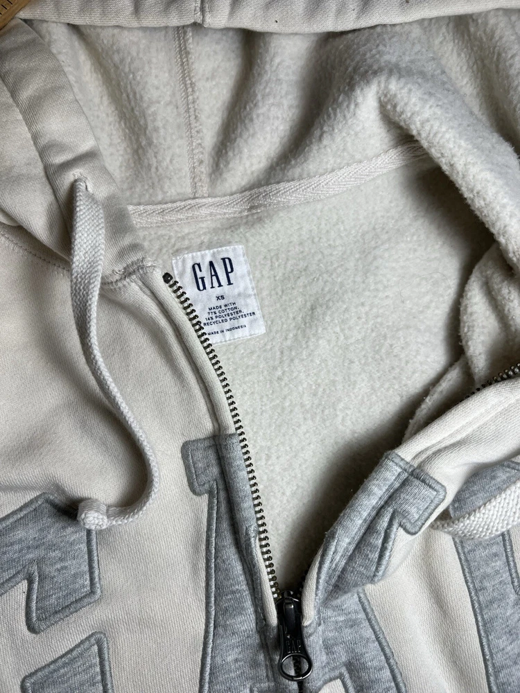 Gap Size XS Cream Gray Long sleeve Logo Full Zip Hoodie Sweater Pre-owned Shows signs of usage such as staining around edges of sleeves, back and front of sleeves Please review all photos Comes from a smoke and pet free home Shipped out with care
