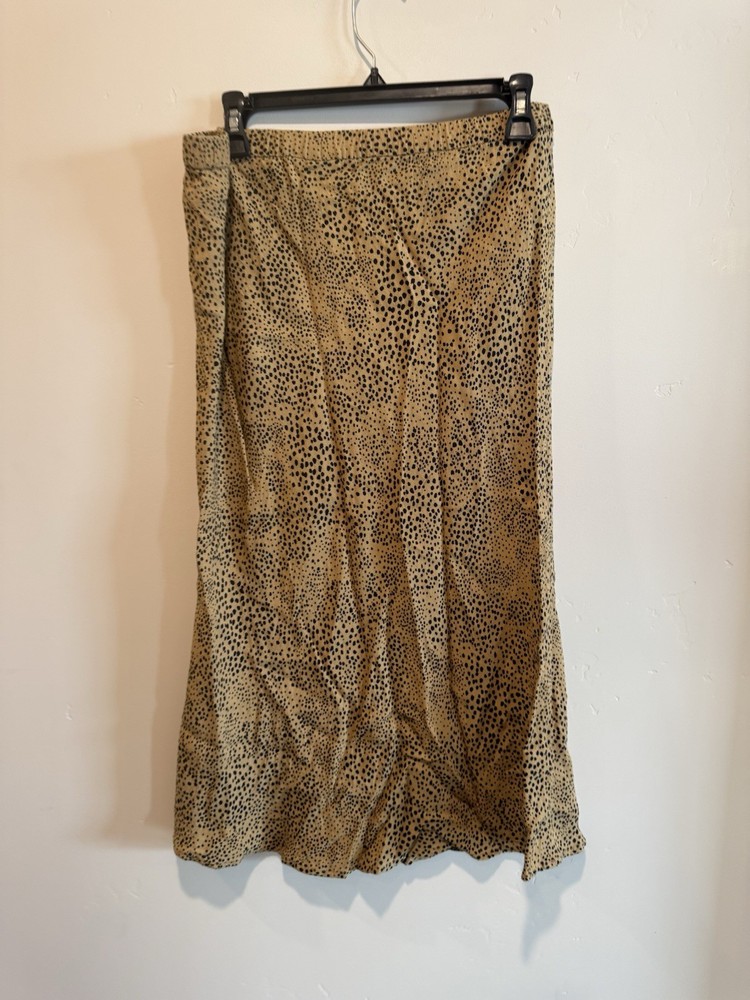 The Gap Tan Animal Print Skirt in size L is a stylish and versatile piece for women. Made by the brand Gap, this peasant-style skirt features a pull-on closure and a midi length, suitable for all seasons. The brown animal print design adds a fun and trendy touch to any outfit, perfect for both casual and dressy occasions. This lightweight skirt is easy to wear and comfortable, making it a great addition to any wardrobe.