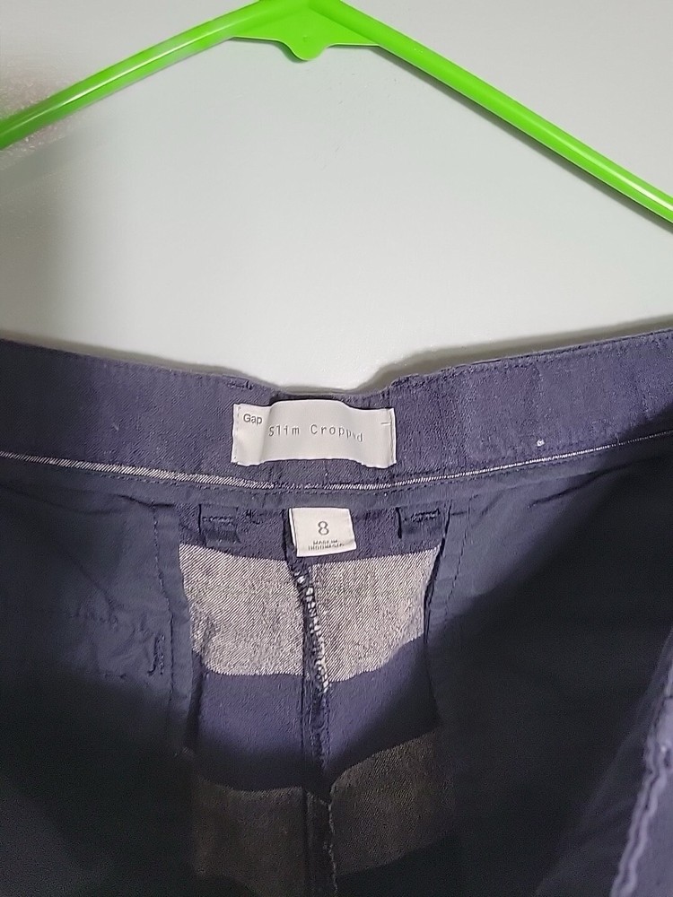 Elevate your casual wardrobe with these stylish Gap women's pants. The blue and gray striped pattern adds a touch of sophistication, while the zip closure and flat front provide a modern look. These pants are made of a comfortable linen/cotton mix fabric and have a mid-rise fit with a tapered leg style. The slimming feature and cropped style make them perfect for a casual occasion, and the waist size of 26 inches and inseam of 27 inches ensure a great fit for size 8 women. Don't miss out on the chance to add these versatile pants to your wardrobe.