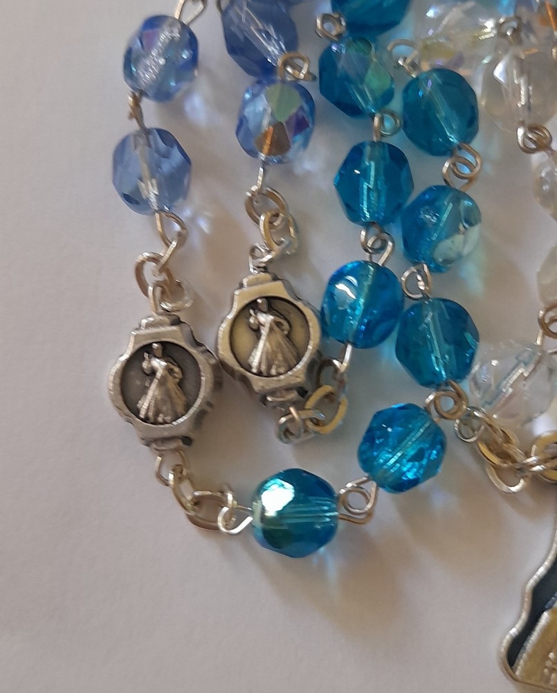 This beautiful Our Lady of Fatima rosary has a silver oxidized crucifix with blue enamel and five different color crystal beads with chain link assembly. The centerpiece and Our Father beads are two-sided. It is made in Italy and is approximately 18 1/4" overall length. Comes in a commemorative box which celebrates the 100 year anniversary of the visions of Our Lady to the children of Fatima. The reliquary medal is free with the purchase of the rosary. This medal contains a small piece of the missal pages kissed by the Blessed Virgin of Carmen in Garabandal during the apparitions from 1961 to 1965. The money raised will go toward a small chapel for the Virgin of Guadalupe.
