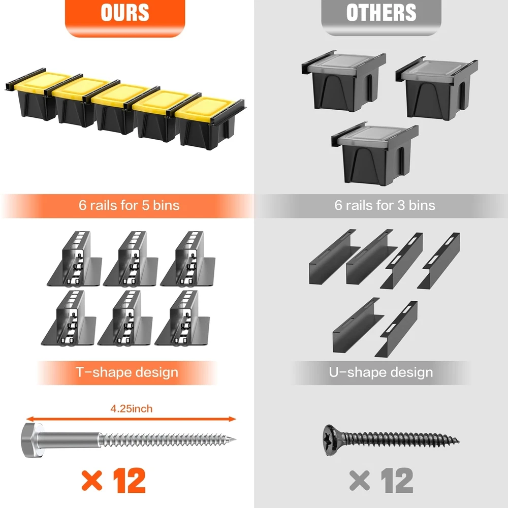 Declutter Your Garage: Our overhead bin storage rack keeps items off the floor and protected. Help to organize your garage and free up floor space. Conveniently store gear overhead with ceiling tote storage system Maximize Unused Ceiling Space: Innovative design turns wasted ceiling space into smart storage. Keep seasonal decor, camping gear and other items out of sight. Expand your storage by maximizing unused ceiling area Sturdy Steel Construction: Built with robust steel to support up to 150 lbs. A scratch and rust-resistant powder-coated finish ensures long-lasting durability, providing stable, secure overhead storage Convenient Overhead Storage: Mounts securely to 16" or 24" ceiling joists for a quick, hassle-free installation. Designed to fit 7-27 gallon storage bins (not included), creating a straightforward solution for overhead storage Smart and Reliable Storage Solution: Designed for lasting performance, this ceiling-mounted storage bin rail system maximizes overhead space, making garage organization simple and efficient