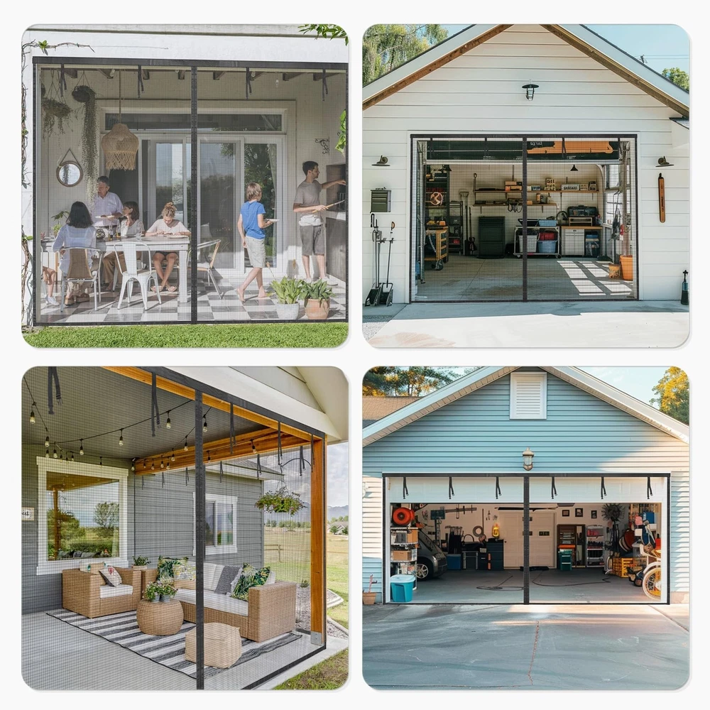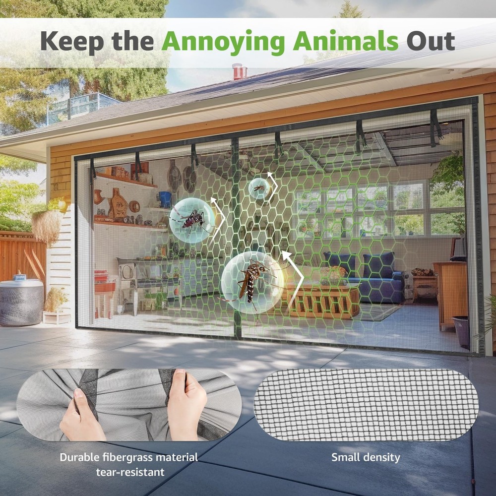 Ideal for garages that double as living areas. Convenient magnetic closure for easy access. Installs in minutes. garage door screen garage screen garage screen doors for 2 car garage pull down garage door screen 1 car garage door screen 2 car garage screen doors for 1 car garage garage net screen magnetic garage door screen garage screen door garage door net screen with magnet single car garage door screen screen for garage door single garage door screen one car garage door screen bug screen for garage garage bug screen magnetic screen door for garage screen for garage door opening 1 car garage door screen 16x7 garage door bug screen 8x7 garage door screen garage mosquito screen garage mesh screen door 2 car screen garage door 16x7 garage door screen garage door net screen for garage door opening 2 car garage net screen 2 car heavy duty garage screen doors for 1 car garage pull down garage door screens garage net Color Specifications/Settings: Black Color, 16x7 ft garage door screen Easy Installation and durability of the garage door screen ENJOY BREEZE: The screen net helps keep pesky animals out and brightens your garage. It seals around the entire edge of the garage door, ensuring that no debris, random leaves sneaks in through the sides, transforms your garage into an extra living space free from little make you crazy animals and dust UNIQUE DESIGN: Strong magnetic and extra gravity sticks closure, directly walkthrough screen doors no matter for human or pets. Extra 16 gravity sticks were added to the bottom sides, which helps with wind resistance. And the strapping tapes at the top allow you to roll up the screen and secure it to the top DIY EASY INSTALLATION: Installs in minutes with the included hook&loop strips, very easy, instant. Extra push pins for added security and strength. The screen mesh is retractable, frameless, detachable, can be folded up for temporary off-season storage PREMIUM FIBERGLASS QUALITY: Made with super-durable fiberglass 18*16 mesh, which is tear-resistant, fireproof, transmitting, corrosion-resistant, good shape, comes with thumbtacks and hook&loop adhesive strips for extra security. Full reinforced edges survive the test of time FITS GARAGE SIZES UP TO 16x7FT: The screen can be used as a replacement for a fixed screen door and fits front, rear, interior or exterior, entry, patio, deck, porch, balcony, glass, and more. IMPORTANT: Measure your garage twice before ordering