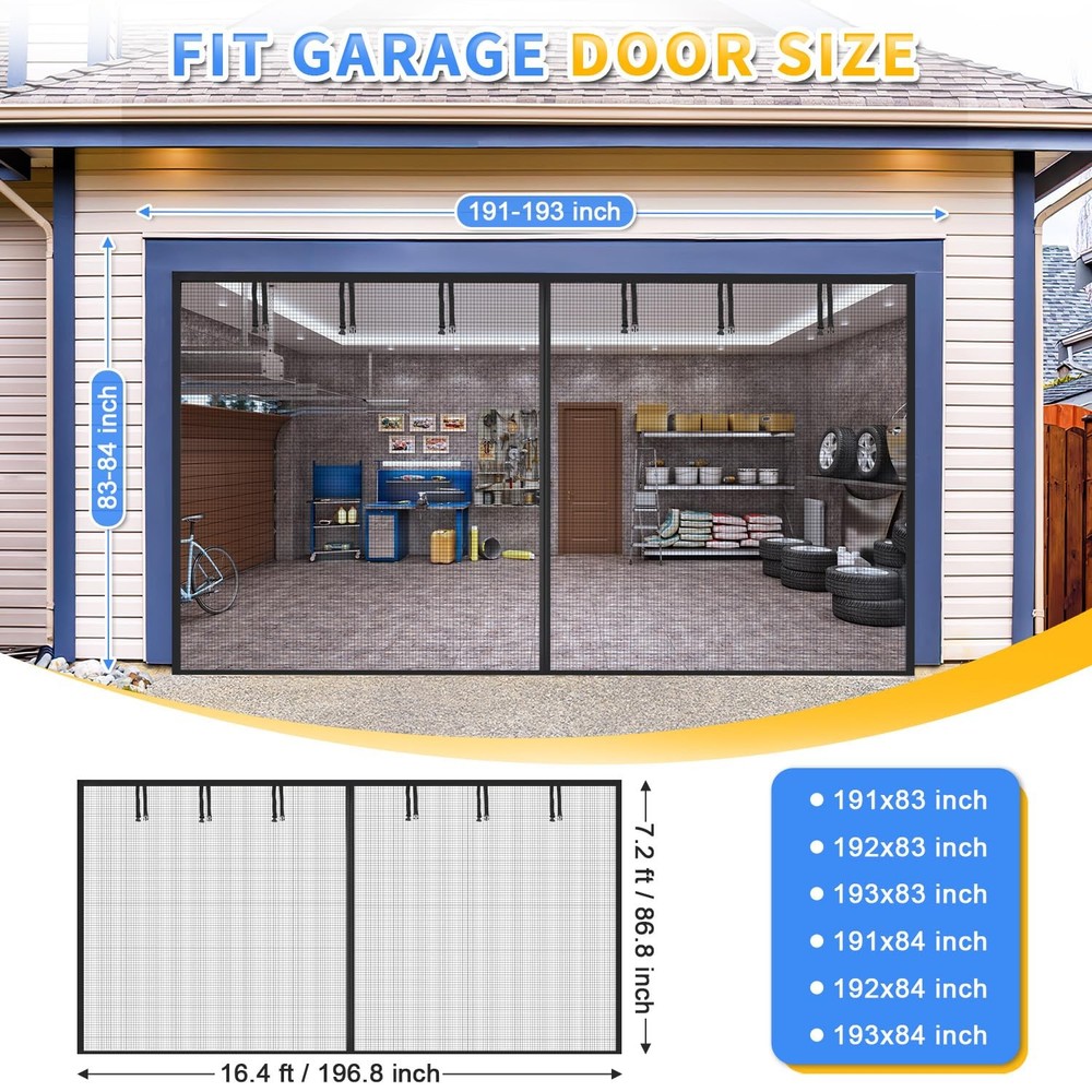 Garage Door Screen 2 Car 16x7ft Magnetic Closure Heavy Duty Weighted Bottom Garage Screen Door, Magnetic Garage Door Screen, Hands Free with 6 Roll Up Starps for Patio, Outdoor, Gym, Crafts Sun House Porch, Reinforced Fiberglass Garage Door Screen, Magnetic Screen Garage with Retractable Fiberglass Mesh and Heavy Duty Weighted Bottom, Hands Free Screen Door, Magnetic Closure Heavy Duty Weighted Bottom Garage Screen Doors for 2 Car Garage, Magnetic Screen Garage with Retractable Fiberglass Mesh, Hands Free Door Screen Kit, Reinforced Self Sealing Fiberglass Mesh Door, Hands Free Door Screen with Closure Weighted Bottom, Garage Door Screen for 2 Car Garage, Fiberglass Mesh Door Screen with Closure Weighted Bottom, Durable Magnetic Heavy Duty Screen Door Curtain Cover Kit with 6 Strapping Tapes, Hands-Free Screen Door Mesh for Garage Door, Hands Free Retractable Garage Net Screen Door Mesh, Magnetic Garage Screen Door for 2 Car Garage 16x7 Ft, Breathable Screen Door Curtain Cover Kit, Sturdy Heavy Duty Fiberglass Mesh Door Screen with Magnets 【Fit 16x7ft Garage Door】Our instant Garage Screen Door is designed to fit 16.4x7.2ft garage doors. It accommodates door sizes up to 191"-193" in width and 83"-84" in height. Can be used as replacement for a fixed screen door and fits front, rear, interior or exterior, entry, patio, deck, porch, balcony, glass, and more. Please Measure your door first and reserve some extra length and width for the door frame, choose the size according to outer diameter 【Upgraded Fiberglass Material Garage Door Screen】The Magnetic Garage Screen Door is made of durable antioxidant glass fiber material: Tearing resistance, fire resistance, breathable, wear-resistant and aesthetic characteristic. The width of the top is widened to 1.5 inches to increase the load-bearing capacity of the hook&loop. Reinforcing the sewn edges to prevent fraying and ensure that nothing sneaks through the sides 【Open Easily & Close Automatically Door Net Screen】The Garage Screen Doors for 2 Car Garage Pull Down is equipped with 36 powerful magnets, it ensures that your Screen Door automatically closes smoothly and tightly. Its hands-free walk-through design lets you enter effortlessly, while 20 weighted rods keep Garage Net Screen flush to the ground—no gaps, no mosquitoes, no frustration. Kids, dogs and cats can go inside and outside of the house with ease 【Keep Bugs Out & Let Air In Screen Door Mesh】With its fine mesh construction, the Retractable Garage Door Screen can effectively prevent insects, mosquitoes and other small animals from entering your garage. Perfect for increasing airflow in your garage, and its good transmittance can give you a better vision, turning your garage into an extra living space in the summer 【Easy Installation Garage Net Screen】The Garage Door Net Screen with Magnet comes with completely assembly kit with step-by-step instruction for easily installation. Simply attach the screen to the door frame with the included hook and loop tape. Extra push pins are included for added security and strength. 6 strapping tapes at the top allows you to roll up the Garage Mesh Screen and secure it to the top. Roll the Garage Bug Screen out of the way when not in use 【Widely Used Magnetic Screen Door】This Garage Mesh Screen can be used as a substitute for fixed screens, suitable for front, rear, internal or external entry, terraces, terraces, porches, balconies, etc. It also fits for back patio, apartment balcony, outdoor workshop, a home gym, garden, floor to ceiling windows of veranda etc. If you have any questions about the Garage Screen Cover, please feel free to contact us through Amazon, 24 on-line support offer quick solution for you