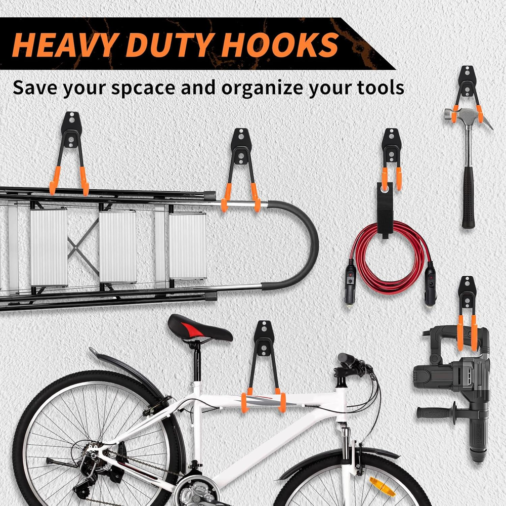【Hanging Garage Hooks of Various Sizes】This garage bike hook set includes 14 garage tool hooks, 2 rope storage straps, screws, and wall anchors. The garage has 5 sizes of practical hooks: 2 large square hooks, 2 medium square hooks, 4 small square hooks, 2 medium J hooks, 2 small J hooks, 2 S hooks with 2 different drywall or concrete wall anchors. 【Premium Material】The garage wall hooks are made of high quality carbon steel and coated with non-slip rubber. These utility garage hooks are of excellent rust and corrosion resistance. Our bike hooks for garage wall are very sturdy and durable, great for organizing and hanging items in your garage. 【Wide Application】The set of garage storage system hooks can be used in garage, shed, warehouse, garden, shop and barn to organize your bikes, ladders, garden tools, power tools, shovel, broom, fishing poles, golf bags or bulk items. 【Easy to Install】It is easy to install those garage hanging hooks with screws and anchors. For plaster wall, you need to use the drywall anchors to install the garage hangers on the wall. For brick or concrete walls, you need to use the other type of wall anchors for added support. 【Space-Saving Tool Hooks】With these shed hooks, you can make full use of wall space and save more space for other items. By using these smartly designed bike hangers , you can save a lot of space of your house and garage. These garage organization hooks are perfect for crowded places. Product Description EZ COZY 16 Pack Garage Hooks - Keep Things Organized and Make Life Easier The heavy duty garage hooks are made of sturdy steel material, and covered with rubber to protect your things from scratching or falling down. The garage wall hooks can be used in garage, shed, warehouse, garden, shop and barn. The set of garage hangers are designed to organize your bikes, ladders, garden tools, power tools, shovel, broom, or bulk items. You can make full use of wall space and save more space for other items with this utility hooks for garage. Equipped with two types of screws and anchors, the garage storage hooks can be easily installed on various walls with only an electric drill and a screwdriver, keeping everything in order. There are multiple sizes of garage hangers to fit all of your needs ranging from items as big as bicycles to the smaller ones like extension cord, perfect for hanging garden tools. Organize your garage with these 16 durable, wall-mounted hooks. Juego de 16 ganchos de pared para garaje, resistentes y duraderos, ideales para bicicletas, escaleras, cuerdas, herramientas y más. Incluye 2 correas para cables de extensión. El color naranja facilita la identificación de tus objetos. Do the hooks need to be mounted into studs? No, they can be mounted into drywall or concrete with the included anchors. Will these hooks rust over time? No, the carbon steel material is coated to prevent rust and corrosion. Are installation tools included? Yes, screws and two types of anchors are provided for installing into different wall types. What color are the garage organization hooks? The wall hooks come in a bright orange color for high visibility in the garage. What is the weight capacity of each hangar? It is in the listing. Depends on which hook and how it is attached to the wall.