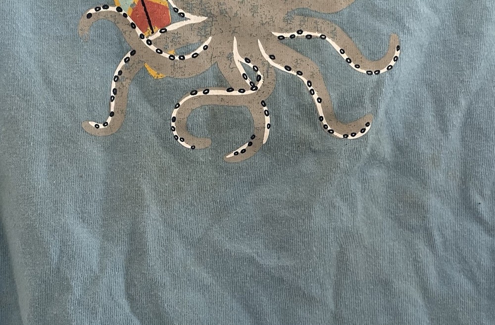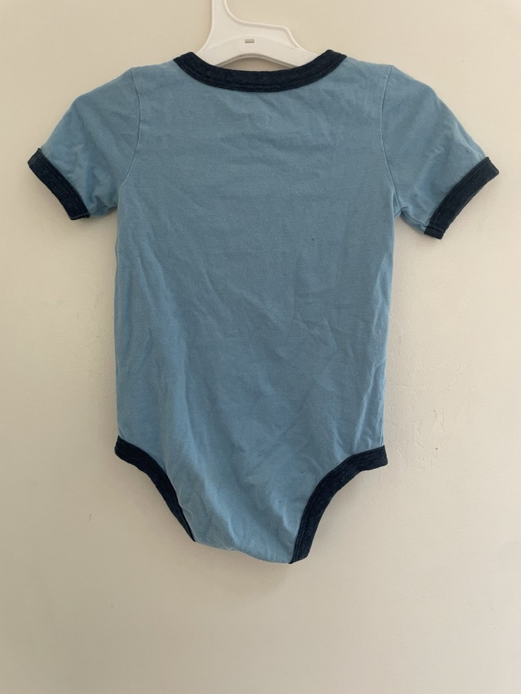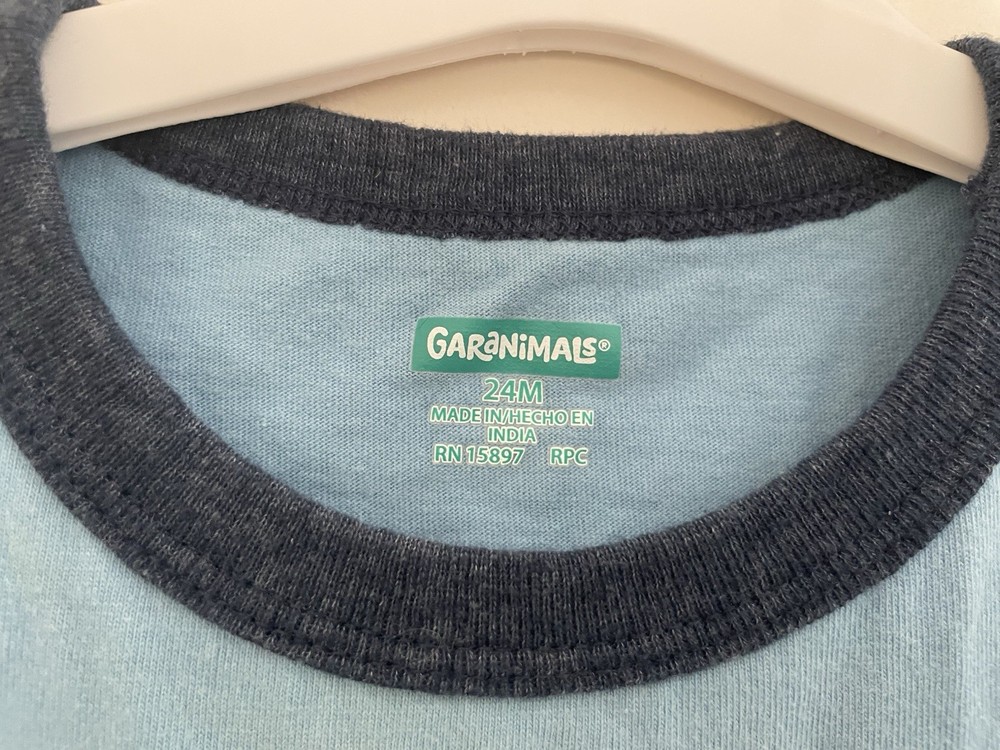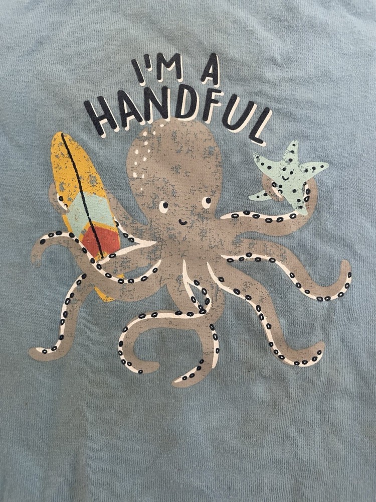 Department: Boys Pattern: Graphic Print Type: One-Piece Garment Care: Machine Washable Country of Origin: India Size: 24 Months Style: Bodysuit Sleeve Length: Short Sleeve Season: Fall, Spring, Summer Material: 100% Cotton Number of Pieces: 1 Piece Brand: Garanimals Character: Boy Features: Comfort, Easy Care, Lightweight, Stretch Closure: Snap Color: Blue Neckline: Crew Neck Theme: Animals, Beach, Octopus, Sea Life Occasion: Casual Set Includes: Bodysuit Seller Notes: “In good condition. There are stains on the front. Free of rips.”