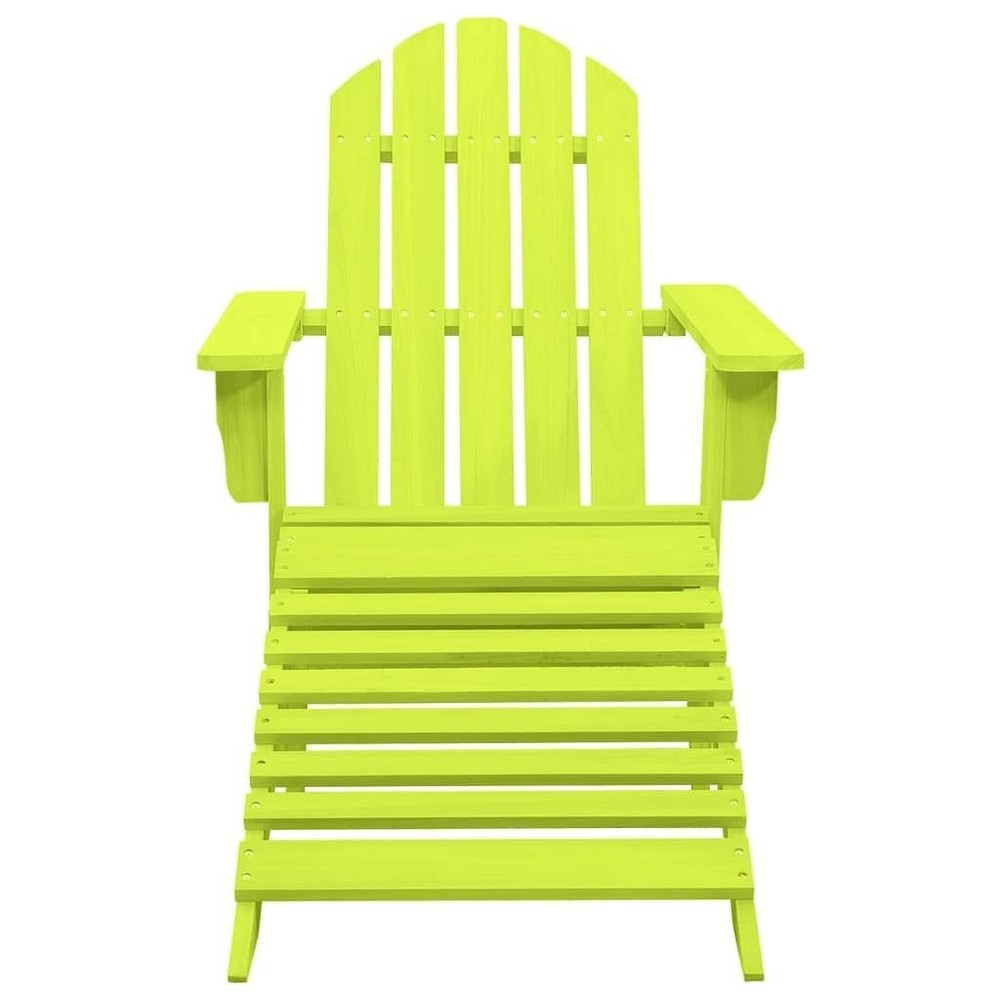 This Green Adirondack Chair with Ottoman is a must-have for outdoor lounging, perfect for those lazy afternoons on the patio or in the garden. The chair's slanted back and wide arms make sitting a delight, encouraging you to kick back and soak up the sun or enjoy the soothing sounds of nature. Ergonomic Comfort: Designed with relaxation in mind, this chair fits your body like a glove, giving you top-notch comfort while lounging. Chill outside for hours without a care. Weather-Resistant Finish: Sturdy solid fir wood is treated with a weather-resistant coating, making sure it can take whatever Mother Nature throws at it. It keeps its good looks season after season. Natural Wood Look: The smooth texture and lovely green finish blend perfectly with your garden, upping the aesthetic game. This chair not only works well but looks fab too! Versatile Ottoman: The detachable ottoman offers ultimate relaxation, letting you kick back and enjoy a good book or a nice drink. It's perfect for a chill escape. Convenient Assembly: This chair is easy to put together and comes with everything you need, so you can enjoy it in no time. Color: Green Shape: Other Finish: Weather-resistant coating Indoor/Outdoor: Outdoor Only Cover Included: No Room: Garden and terrace Maximum Number of People: 1 Maximum Weit: 242.5 lbs Mounting Included: No Dimensions: 58.1 x 27.6 x 34.8 in (W x L x H) Weight: 21.14 lbs Seat Depth: 19.3 in Seating Capacity: 1 Swings: No Delivery Contains: Garden chair with detachable ottoman Assembly Required: Yes Recommended Number of People for Assembly: 1