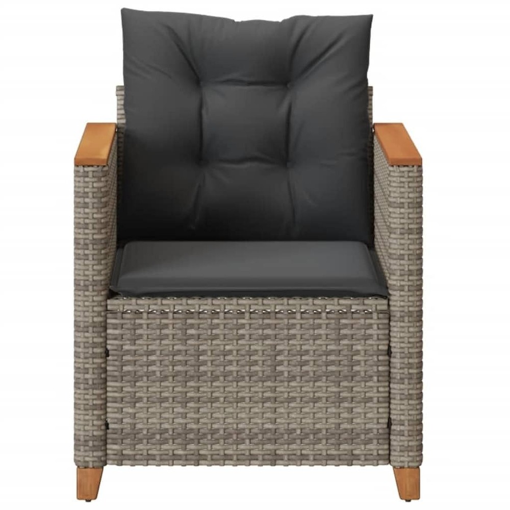 Size: Standard This armchair is all about comfort for outdoor relaxing. With a smooth, cushy seat, this garden chair blends modern style with practical design, making it a great add-on for your patio, balcony, or backyard. It has a stylish grey poly rattan finish and tasteful acacia wood bits that not only make it a comfy seat but also a trendy piece of outdoor furniture that enhances any space. Comfy Cushions: The seat and back cushions are well-padded for total comfort during long sits, perfect for relaxed dining or chilling out. The removable and wash-friendly covers make keeping them fresh a breeze. Sturdy Frame: Made from strong powder-coated steel, the garden chair is built to last. This solid construction can handle different weather, giving you reliable seating. UV-Resistant Material: The poly rattan is UV-resistant, so your chair keeps its look and strength even in the sun, great for year-round outdoor use. Adjustable Features: With adjustable feet, the chair stays stable on various surfaces, easily adapting to outdoor spots. Perfect for patios and decks where ground can be uneven. Chic and Modern: The sleek design, with its clean lines and grey finish, adds a contemporary flair to any outdoor area, nicely complementing any modern decor. Color: Grey Shape: Rectangular Material: Synthetic Poly Rattan Finish: Powder-Coated Indoor/Outdoor: Indoor / Outdoor Cover Included: No Room: Garden and terrace Maximum Number of People: 1 Maximum Weit: 242.5 lb#Dimensions: 26.4 x 24.0 x 27.2 in (W x L x H) Leg Height: 2.4 in Weight: 19.84 lbs Seat Depth: 22.4 in Seating Capacity: 1 Swings: No Delivery Contains: 1 x Garden chair Assembly Required: Yes Recommended Number of People for Assembly: 2