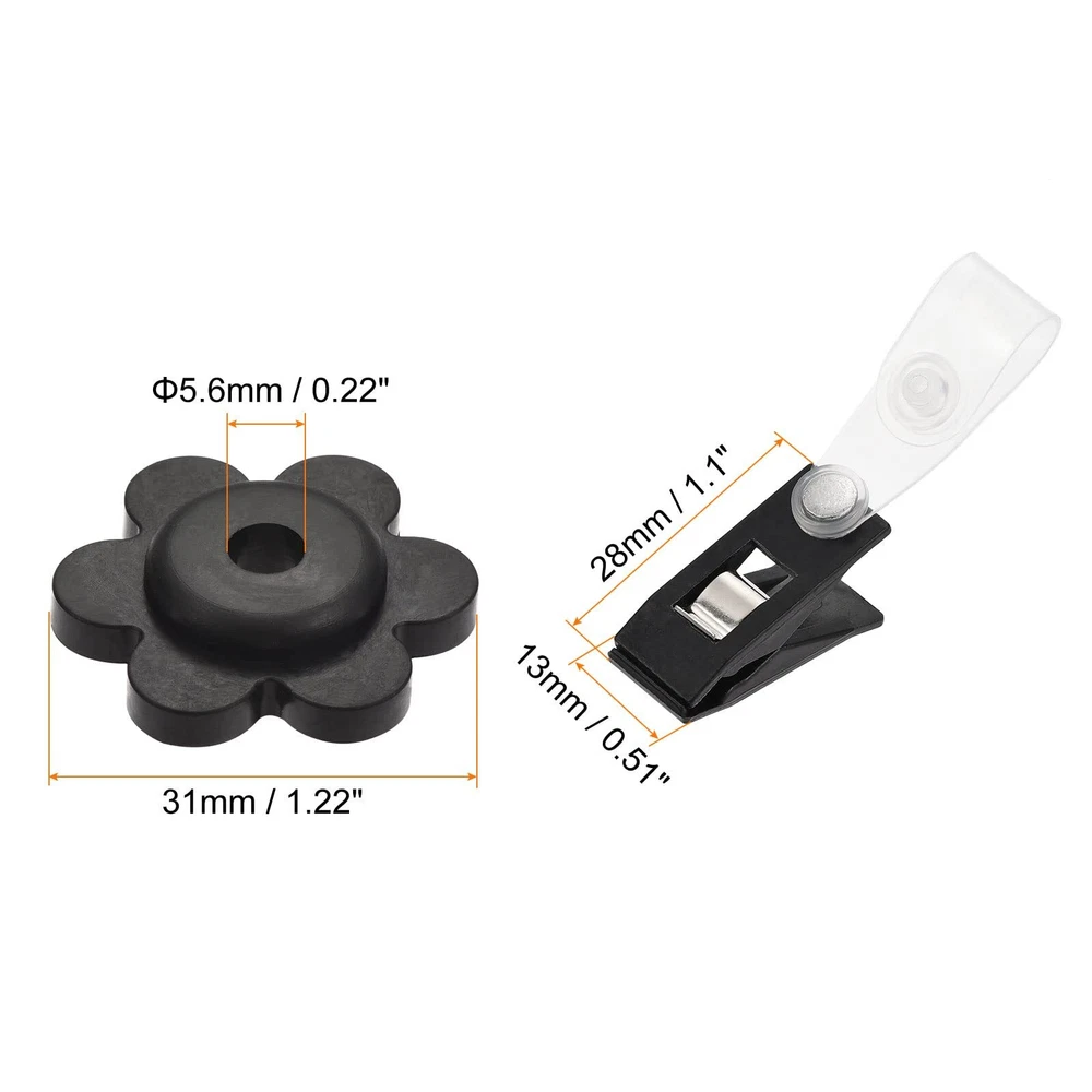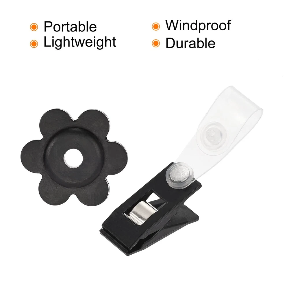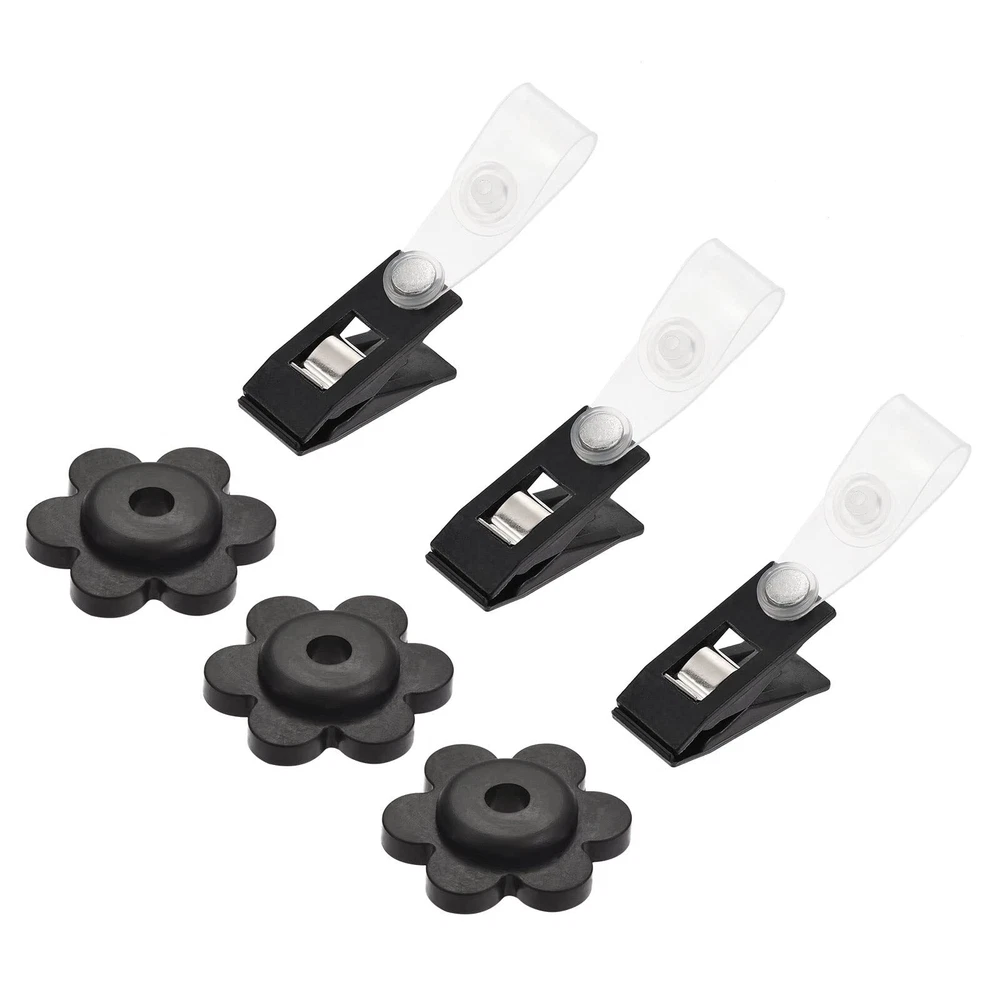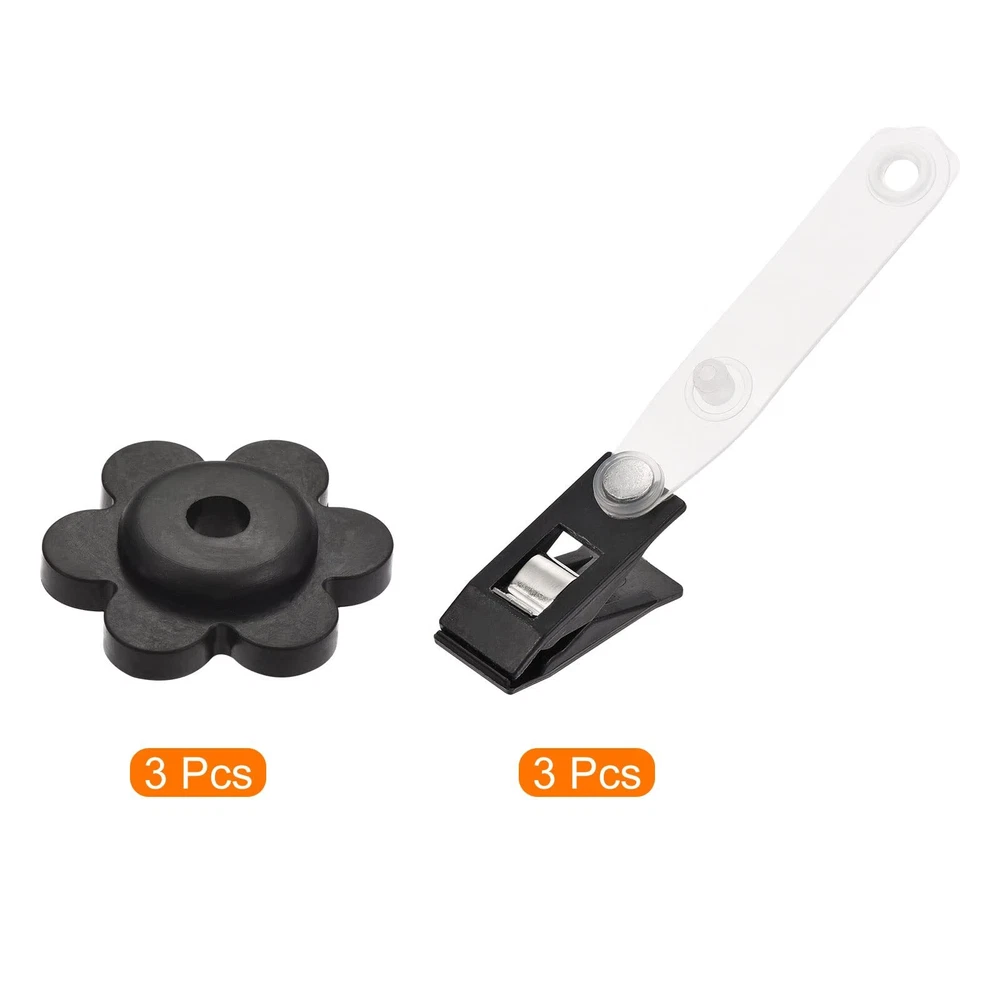 What is this? The garden flag stopper is made of durable rubber with a flower-shaped design. The anti-wind clip is made of durable plastic with a clear strap. The clip can hold down the corners of your garden flags for garden flags and the stopper can prevent your flags from flying away in the wind. What will I get? Color: Black Material: Plastic, Rubber Clip Size: 28mmx13mm / 1.1"x0.51" (L*W) Clip Opening Width: 5.5mm / 0.22" Stopper Max Outer Diameter: 31mm / 1.22" Stopper Hole Diameter: 5.6mm / 0.22" Package Content: 3 x Flag Stoppers, 3 x Anti-Wind Clips Are there any advantages of the product? Windproof, lightweight, sturdy and durable; the stopper and clip kit can withstand various weather conditions and fix the flag firmly, keeping the flag in place. How to use it? Easy to use, use the transparent part of the clip to fix the flag stand or pole, then put the corner of the flag into the clip and fix it; pass the stopper through the flag stand or pole. What should I notice? Please confirm the diameter of the stand rod and select the appropriate size of the flag stopper and anti-wind clip. Windproof, lightweight, sturdy and durable; the stopper and clip kit can withstand various weather conditions and fix the flag firmly, keeping the flag in place Clip Size: 28mmx13mm / 1.1"x0.51" (L*W); Clip Opening Width: 5.5mm / 0.22"; Stopper Hole Diameter: 5.6mm / 0.22"; Package Content: 3 x Flag Stoppers, 3 x Anti-Wind Clips The garden flag stopper is made of durable rubber with a flower-shaped design. The anti-wind clip is made of durable plastic with a clear strap. The clip can hold down the corners of your garden flags for garden flags and the stopper can prevent your flags from flying away in the wind Easy to use, use the transparent part of the clip to fix the flag stand or pole, then put the corner of the flag into the clip and fix it; pass the stopper through the flag stand or pole Please confirm the diameter of the stand rod and select the appropriate size of the flag stopper and anti-wind clip