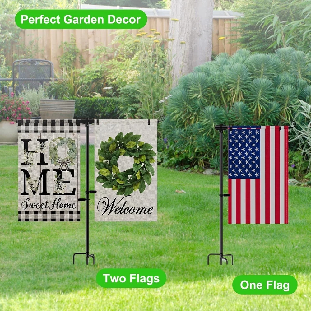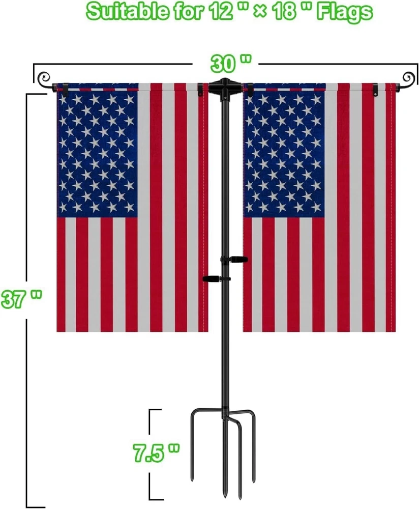 About this item 4 Prong Base & Extra Thick Pole - Our outdoor garden flag stand comes with a 4 prong base, which is more firmly planted in the ground than 2 or 3 Prongs without easily falling down. 3/4" diameter extra thick pole definitely bears more weight, can avoid metal flag stake bending and breaking. Premium Quality - Garden flag holders are made of high-quality aluminum with exquisite surface anodization process. They are weather resistant and steady. 3/4" diameter extra thick pole definitely bears more weight, can avoid metal flag stake bending and breaking. Perfect for Double Flags - This garden flag holder can display two flags at the same time for New Years, Valentine's Day, Easter, Mother's Day, Memorial Day, Flag Day, Father's Day, Independence Day, Labor Day, Halloween, Thanksgiving, Christmas, etc. Tip: Pictured garden flags are from Amazon store "ORTIGIA Home Decor" Easy to Assemble: Comes with screw-in joints for quick installation, each part can be quickly and easily screwed together and securely fastened, and you will get a strong flag stand in about one minute. The anti-wind clips included to keep your favorite flag in place! Let your flag float in the wind and rain, and not messy or fly away! 100% Customer Satisfaction: We truly want you to be happy with your new flag pole, if you have any questions with our products, please do not hesitate to contact us at any time and our professional customer service will do whatever it takes to ensure your satisfaction.