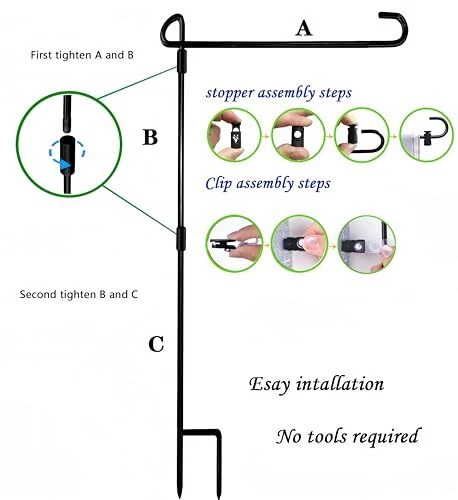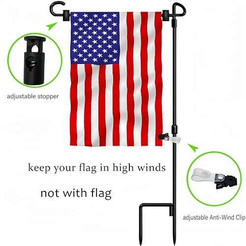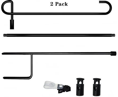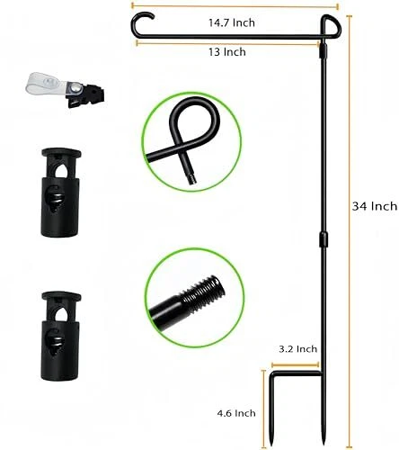 Feature 1- Easy to Install:The garden flagpole is easy to install, only needs to tighten the three parts to each other, and is easy to operate without tools. The bottom of the flagpole is machined and easily inserted into the ground without damaging the environment. 2- Show life, highlight the festive atmosphere. For example, our garden flag stand suitable for New Year's Day, Lincoln's Birthday, St. Valentine's Day, Washington's Birthday, St. Patrick's Day, April Fool's Day, Easter, Arbor Day, Mother's Day, Memorial Day, Flag Day, Father's Day, Independence Day, Labor Day, Veteran's Day, Halloween, Thanksgiving Day, Christmas ect. 3- The accessories are complete, you can use it when you buy.Rugged and durable flagpole with flag stoppers and Anti-Wind Clips . Buy and use, let your beloved flag float in your garden forever Packing include: garden flag stand x 2 Anti-Wind Clips x 2 Garden flag Stoppers x 4 Quickly join the shopping cart and enjoy the joy of every day. For all season garden flags:welcome flag,decorative flags,yard flags,small garden flags,lawn flags,seasonal flags,outside flags,the flag width of 14" or less Strong and sturdy yard flag stand:Made of rust-proof black metal, not easy to bend. Three-stage design style for easy storage Perfect garden flagpole set:Rugged and durable flagpole with flag stoppers and Anti-Wind Clips . Buy and use, let your beloved flag float in your garden forever Small flag pole size is 36x15.7 inch