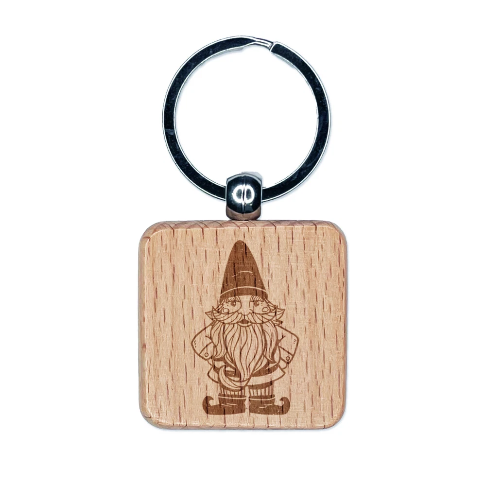 Garden Gnome Engraved Wood Square Keychain Tag Charm