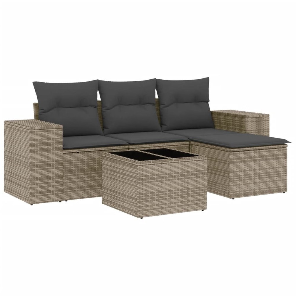 Size: 5 Piece Set This outdoor sofa set gives you a lovely mix of comfort and practicality, perfect for laid-back outdoor living. The stylish grey poly rattan finish makes it a fab addition to your patio or deck, encouraging gatherings with friends and family. With its clean lines and smooth materials, it's a trendy backdrop for lounging, plus the cushions make it super comfy, whether you're relaxing or enjoying long chats over warm summer evenings. Modular Design: The modular setup lets you rearrange the pieces to fit whatever vibe you're going for, helping you make the most of your space. Weather-Resistant Fabric: Built with UV-resistant materials, this sofa set can handle whatever the weather throws at it, keeping its beauty and usefulness intact over time. Easy Care: With removable cushion covers that zip off, cleaning the sofa is a breeze. Just unzip, wash, and pop them back on to keep it looking fresh. Spacious Capacity: Made to comfortably seat up to five people, this set is perfect for social events and family get-togethers. Plenty of space means everyone can chill in comfort. Elegant Aesthetic: The sleek grey color and smooth look of the synthetic materials give it a classy appearance, effortlessly enhancing your outdoor décor and creating a welcoming atmosphere. Color: Grey Shape: Rectangular Material: Synthetic Poly Rattan Finish: Matte Indoor/Outdoor: Outdoor Only Cover Included: Yes Capacity: 5 Piece Sofa Set Maximum Number of People: 5 Maximum Weit: 242 lbs Dimensions: 21.7 x 21.7 x 14.6 in (W x L x H) Leg Height: 14.6 in Seat Depth: 21.7 in Seating Capacity: 5 Swings: No Delivery Contains: 1 Centre seat, 2 Arm sofas, 1 Footstool, 1 Garden table, 3 Back cushions, 4 Seat cushions Assembly Required: Yes Recommended Number of People for Assembly: 2