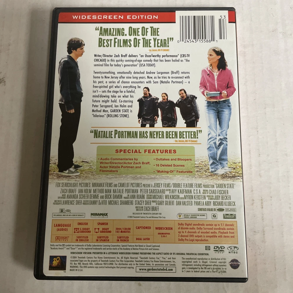This DVD features the 2004 comedy-contemporary film "Garden State" directed by Zach Braff. The movie stars actors Dan Halsted, Gary Gilbert, Pamela Abdy, and Richard Klubeck, and has a rating of R. The DVD is in the format of a disc and is available in Spanish and English languages. It was produced by a team including Dan Halsted, Gary Gilbert, Pamela Abdy, and Richard Klubeck. The movie was released in 2004 by Fox Searchlight studio. This DVD is a great addition to any movie collection and is perfect for fans of the comedy-contemporary genre.
