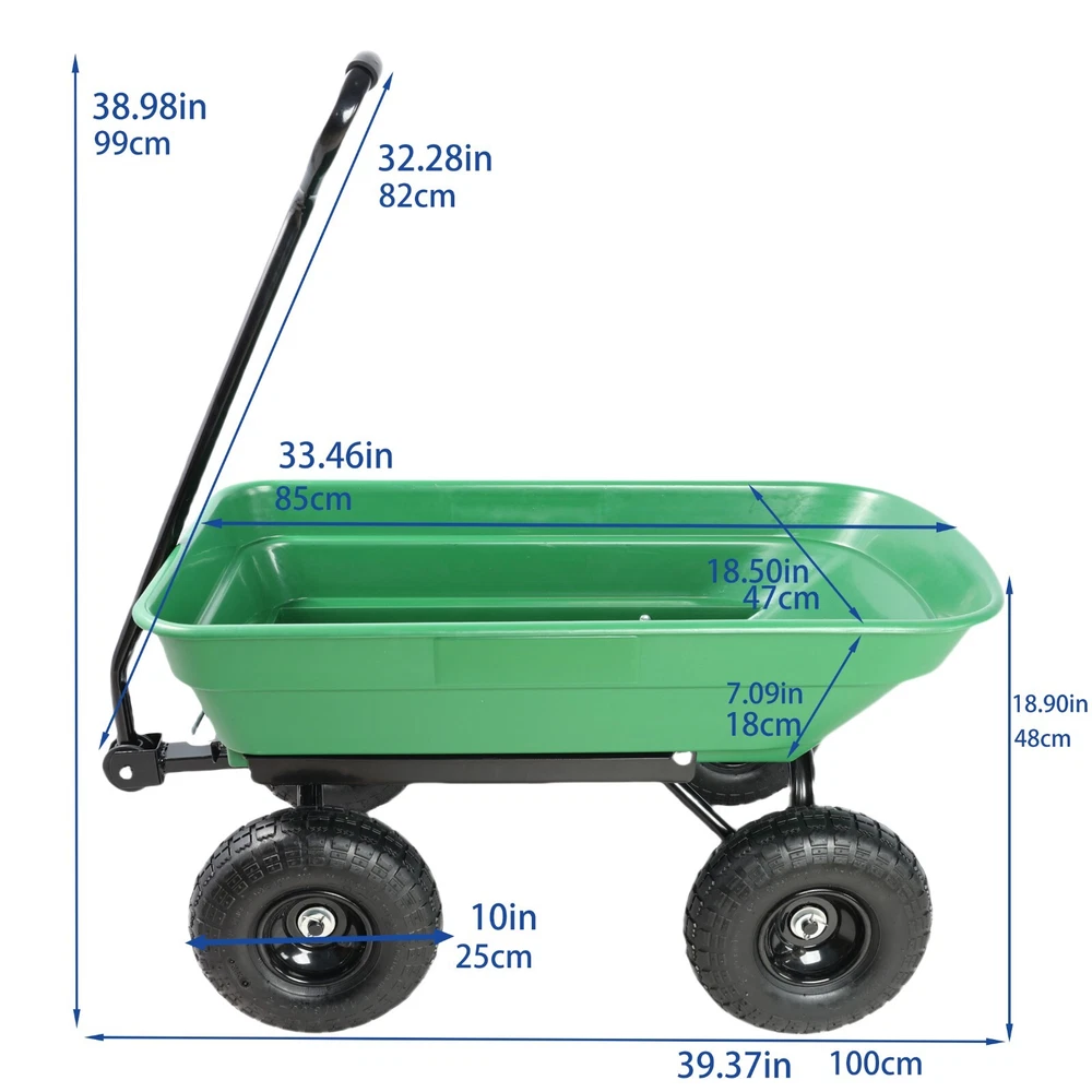 Product Features 【High quality materials】 The Garden Wagon Cart vehicle is made of heavy plastic and durable steel frame.The soft sponge hand-holder protects your hands while pulling the cart. 10-inch pneumatic turf tires to tackle any terrain. 【Big Cart Capacity】 Load supplies up to 300lbs on the flat platform while the tilted shape holds and dumps up to 200lbs. Wagon Carrier is large enough for you to load lots of stuffs if you need. 【180 Degree Turn】 Garden Dump Cart handle has a 180 degree turn range that makes transportation quick and easy. It is long and flexible enough to adjust angle as needed. 【Durable and Light】 This Wagon Carrier can be a good helper in life. Once the cart reaches the destination, supplies, such as sand or gravel, can easily be dumped. EASY ASSEMBLY】 Our garden cart can be easily installed with the tools we have. It will become your right-hand man. On Nov 5, 2024 at 18:47:32 PST, seller added the following information: