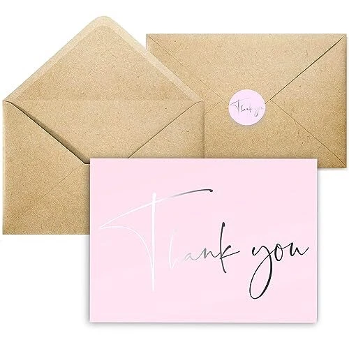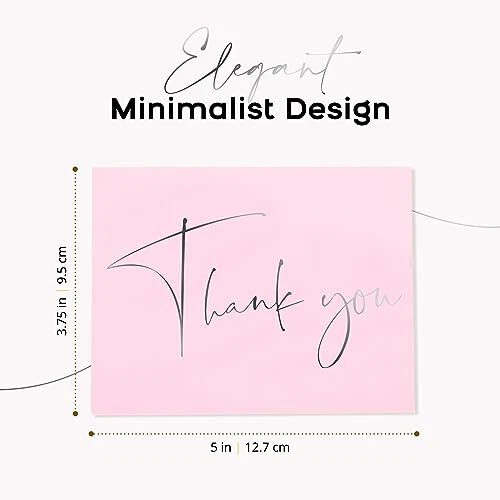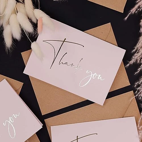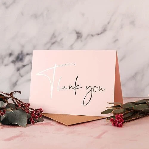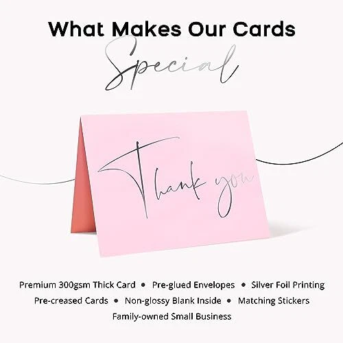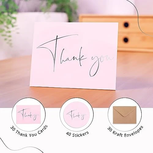 Premium Quality Thank You Cards for all occasions - Weddings, Baby Shower, Bridal Shower, Small Business, Graduation, Baptisms, Birthday, Funerals, Engagement Parties etc PREMIUM QUALITY – Our blush pink thank you cards with envelopes are pre-creased and printed on thick 300 gsm smudge-free card. All greeting cards come in a durable box for easy storage. ENVELOPES & STICKERS INCLUDED - Each set contains 30 thank you cards together with 30 kraft envelopes and 40 stickers. All the envelopes are pre-glued, making them easy to seal. The stickers with matching silver foil design are provided for additional adhesion. MODERN & ELEGANT –The minimalist design with silver foil text provides a meaningful way to say thanks. Our thank you cards are ideal for personal or professional use. PERFECT SIZE - Our bulk thank you cards measure 5x3.75” when folded. The matte cards are blank inside allowing plenty of space to share your sincere thanks. CELEBRATE ANY OCCASION - Keep a pack of thank you cards with envelopes on hand, ready for weddings, engagement parties, birthday parties, baby showers, bridal showers, business events, religious holidays, anniversaries, funerals, customer appreciation, or any other occasion.