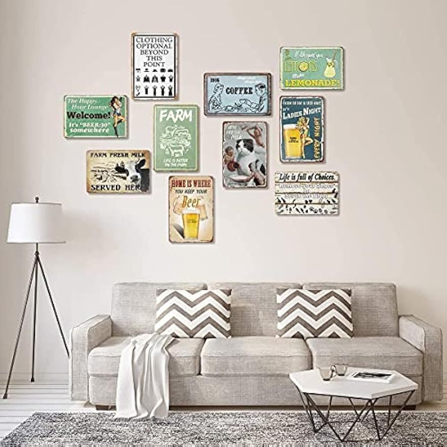 Product Description Our signs measure approximately 8x12 inches. Great for everyday use. Enjoy these stylish signs in your home areas such as backyard bar, patio, deck, porch as well or indoor kitchens, garages, and restaurants. Four small pre-drilled holes in each corner of this painting, can be mounted on the wall by nails on 4 corners or double-sided tape or blu--tack. to easily hang the home décor signs. No complicated setup or installation, simply use nails or screws to mount these durable signs. This tin sign vintage decorative painting is manufactured with folded edges for safety and stability. They are even lightweight enough to be mounted with double-sided tape or command strips.some paintings appear to have the effect of rust, it is printed up, not really rusty. every tin sign will be put into a bag, and we will pack every item, so that you can receive the undamaged package.