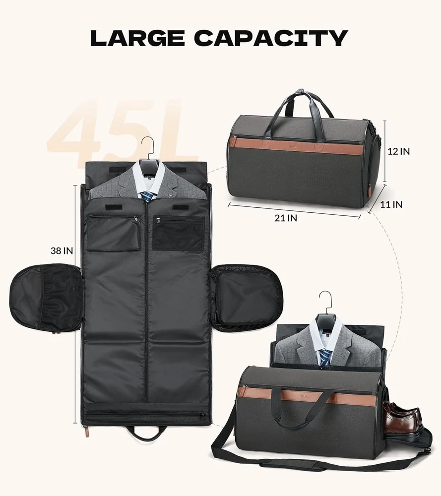 Thanks! Garment Bags for Travel - 2 in 1 Suit Bag for Men Women 45L Garment Duffle Bag 2 in 1 convertible garment bag: This garment travel bag can be converted to a garment bag or a travel duffle bag. The size of the suit bag is 21 x 11 x 12 and the capacity is 45L which is roomy enough to hold your travel essentials and convenient to carry everywhere Great garment bags for hanging clothes: While opening this garment bag and laying it out, the handle can be hung on the hook. The suit bag travel has 6 inner pockets including 1 necktie pocket, 2 small zipper pouches, 1 mesh slip pouch, 1 padded laptop pocket and 1 suit compartment. It can store your suits and dresses and other small accessories 45L Large travel bag: Besides the internal pockets mentioned above. After assembly, this garment duffel bag works great as a 45L duffel bag. It has a separate shoe compartment on the side, 1 large front zipper pocket, small items storage pouch, 1 back ticket pocket Duffle bag for travel with shoe compartment: This travel garment bag has a separate shoe pouch that can hold your shoes or dirty clothes, making it easy to separate them from your clean clothes Multifunctional carry on duffel bag: The overnight bag can be assembled by connecting multiple zippers, and the small buckles on both sides can keep the bag from unraveling. Thick fabric and water resistant surface make the travel bag more convenient to use. The trolley sleeve can be slid over the suitcase handle to keep stable and secure. it also can be used as a travel bag, carry on bag, overnight bag, suit bag, or garment bag when tr Shipping We offer FREE shipping on all orders! We ship within Three business days of payment, usually sooner. We use a selection of shipping services such as UPS, FedEx, USPS etc. We only ship to the lower 48 states, no APO/FPO addresses or PO Boxes allowed. Local pickups and combined shipping options are not provided at this time. Return You can return a product for up to 30 days from the date you purchased it. Any product you return must be in the same condition you received it and in the original packaging. Please keep the receipt. Customer satisfaction is very important to us. If you have any problem with your order, please contact us and we will do our best to make you satisfied.