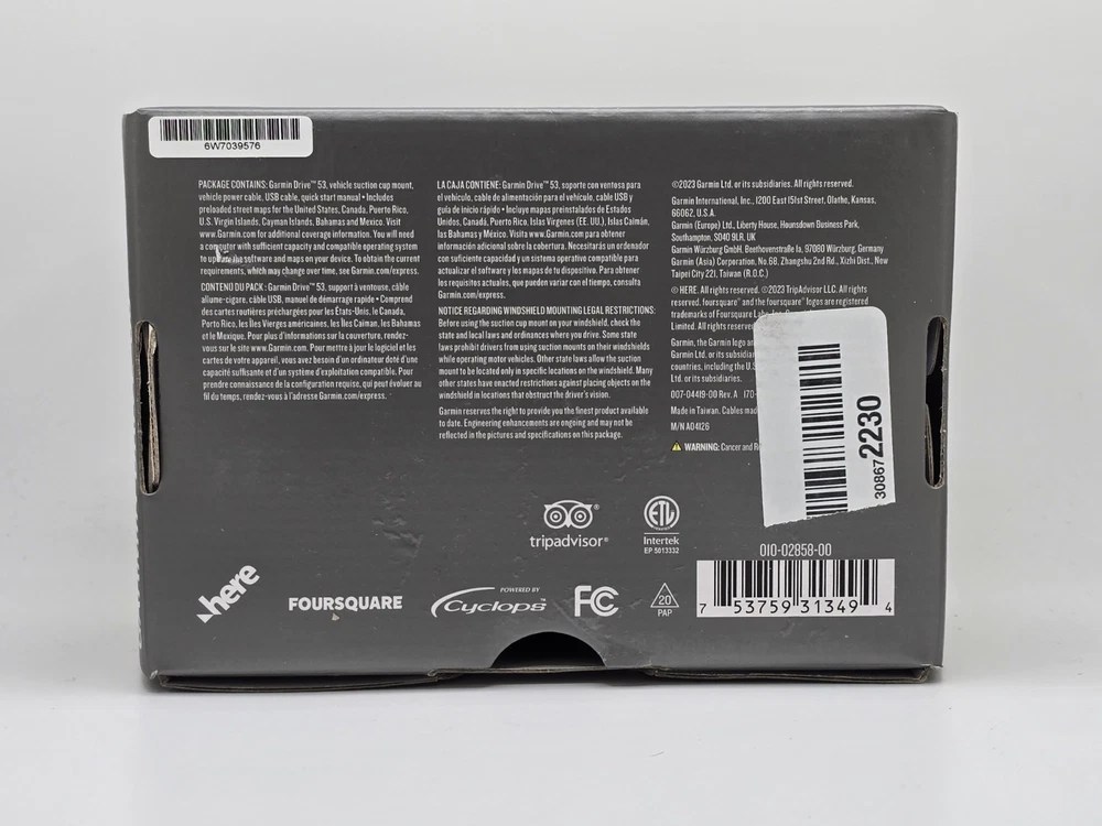 gtin13:753759313494MPN:010-02858-00Model:Garmin GPSFeatures:Car Charger, Map UpdatesBrand:GarminUPC:753759313494Country/Region of Manufacture:TaiwanType:Automotive MountableSeller Notes:“Costumer return, powers on but not tested, has signs/scuffs of use, what you see is included.”Screen Size:5"