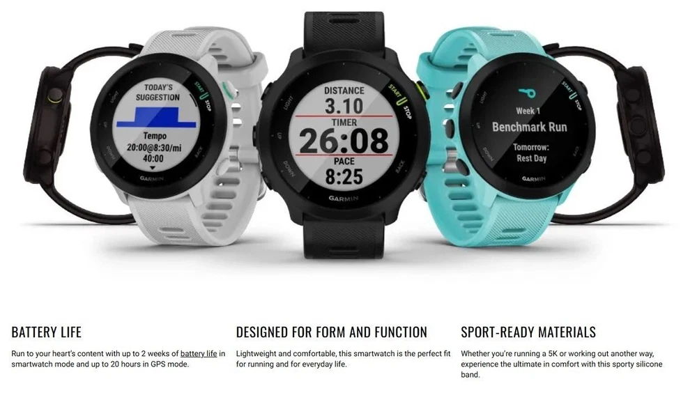 The Garmin Forerunner 55 White GPS Running Smartwatch is a stylish and functional fitness tracker designed for women. With a sleek white design and durable rubber and silicone materials, this smartwatch provides accurate measurements for heart rate, speed, cadence, time, distance, and calories, making it ideal for gym workouts, swimming, and running. The watch also features a variety of useful features including a calendar/date display, average speed calculation, alarm, stopwatch, GPS tracking, pedometer, clock, data review, compass, and calorie and heart rate monitoring. It is powered by batteries and has a display resolution of 208 x 208, providing a clear and easy-to-read interface for all your fitness goals.