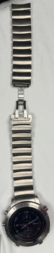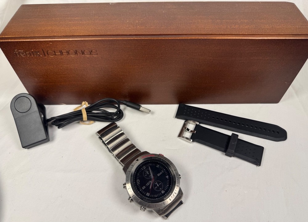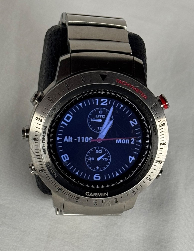 I am the original owner and used it lightly but it’s been well maintained and operates perfectly. This is the titanium version (indicated by red vs black start/stop button and single link band vs woven stainless steel band). Originally the titanium version sold for $1499 vs the stainless ($1000) and leather band with stainless housing ($900). The titanium version is substantially lighter than the stainless (103g vs stainless at 184g). Includes original box, titanium band, alternative black silicone band and brand new charger. The Garmin fēnix Chronos Titanium is a premium, rugged multisport watch featuring a lightweight, jeweler’s-grade titanium housing and band. It combines advanced GPS/GLONASS navigation, heart rate monitoring, and Sapphire lens durability with a sophisticated aesthetic, boasting a 1.2-inch color display and 100-meter water resistance. On the back of the case there is some wear relating to the removal of some engraving but this is cosmetic only and can’t be seen when the watch is worn.