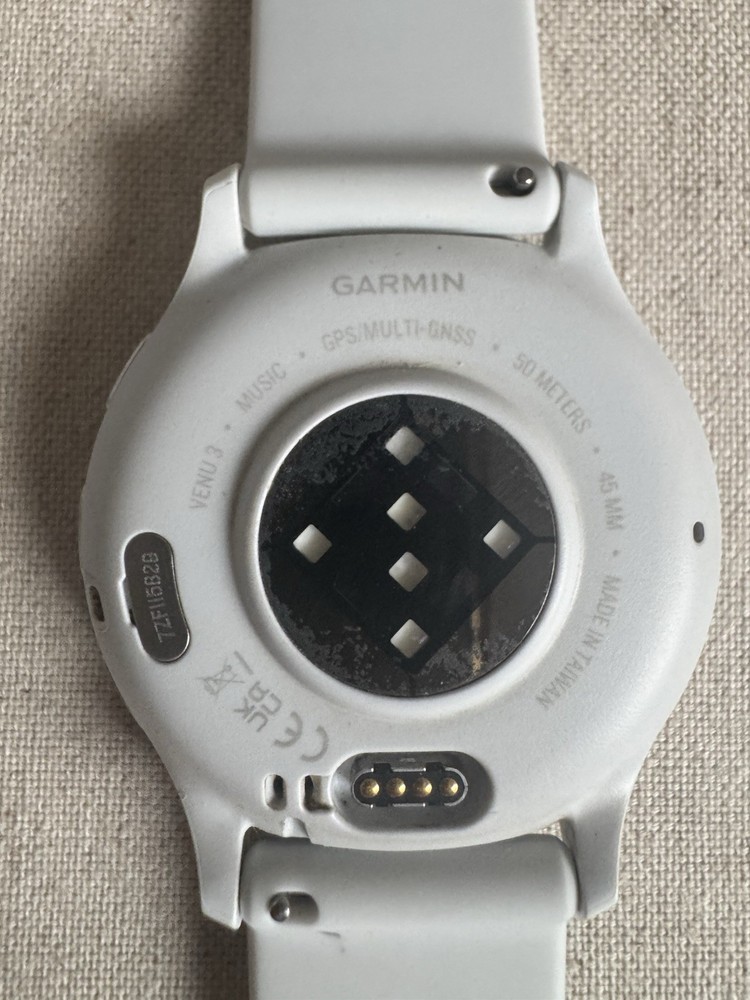 For sale is a used Garmin Venu 3 GPS/Multi-GNSS smartwatch in white (45mm). Features include: • GPS / Multi-GNSS navigation • Music storage and playback • Water resistance up to 50 meters • Heart rate and fitness tracking sensors • Bright AMOLED display • Lightweight design, perfect for everyday wear and workouts Condition: The watch is fully functional and in very good working condition. There are visible signs of wear on the back (see photos), but this does not affect performance. Original strap included. What’s included: • Garmin Venu 3 smartwatch (white, 45mm) • Original white silicone strap and other bands • Charging cable (if you include it — specify here) + original box with docs