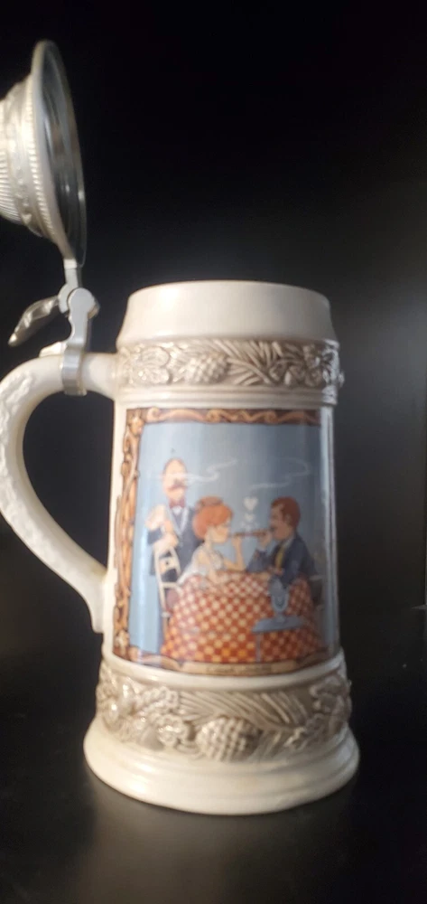 This Gary Patterson Stoneware Smoking Beer Stein is a must-have for collectors and beer enthusiasts alike. The thumb open lid and the cold beverage type make it perfect for any occasion, while the multicolor design adds a touch of novelty to your drinkware collection. Made of high-quality stoneware by Gerz, this stein stands more than 8 inches tall and features a smoking theme that is sure to impress. The craftsmanship of this stein speaks for itself, and its country of origin, Germany, only adds to its appeal. This item is perfect for a single user, as it serves one. Whether you're a collector or just looking for a unique addition to your kitchen, the Gary Patterson Stoneware Smoking Beer Stein is sure to impress.