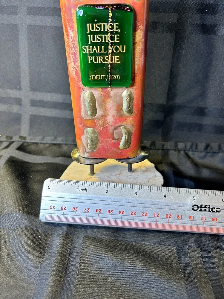 Gary Rosenthal Combines Copper, Steel, Brass And Fused Glass To Create This Sculptural Display Torah Sitting On A Marble Base. The Fused Glass Front Screened With "Justice, Justice, Shall You Pursue," Makes This A Wonderful Gift For Your Favorite Attorney, Judge or Anyone who seeks out Justice in Our World! The Torah Is 9" High X 3" Wide X 3" Long. This Sculpture is Hand Signed on the Bottom G.R. '08 Making it a rare item since he only signed the items he actually made personally.
